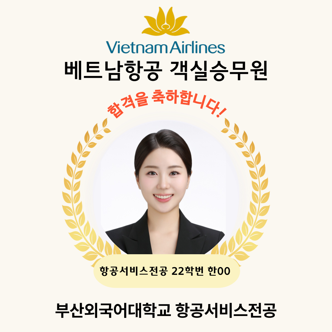 취업정보 취업명단 [객실승무원] 2025년 베트남항공 합격자 한OO 합격을 진심으로 축하드립니다. 자랑스러운 부산외대인으로의 멋진 앞날을 기원합니다. 항공서비스학과관리자2025. 11. 21조회수292 0 등록된 댓글이 없습니다. 2025년 12월 에어서울 채용목록[객실승무원] 2025년 베트남항…