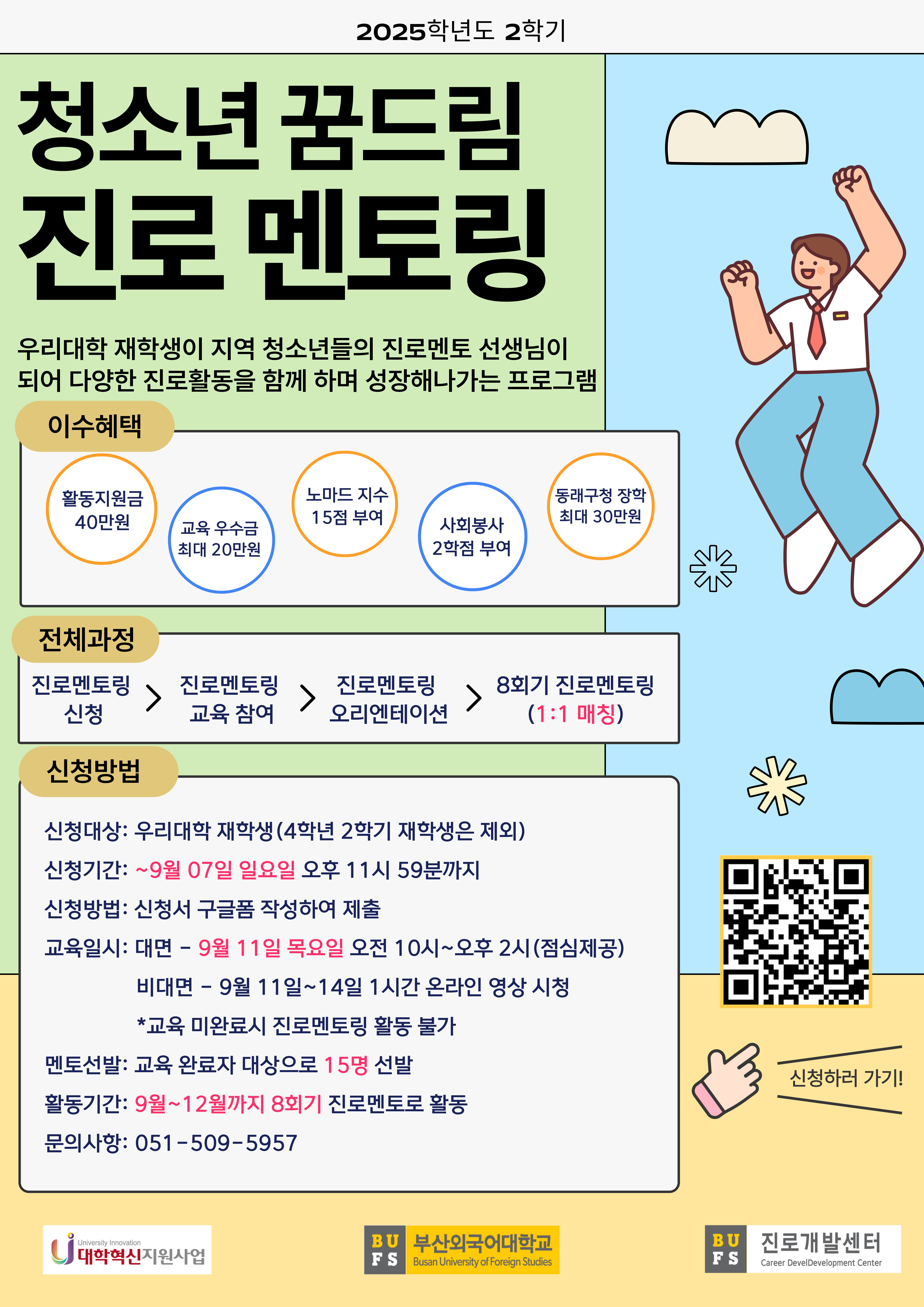 공지사항 [2025학년도 2학기] 청소년 꿈드림 진로멘토링 프로그램 멘토 모집! 진로개발센터관리자2025. 8. 19조회수159 [2025-2학기] 후배사랑 진로…목록[2025-2학기]자유학기제 커리…