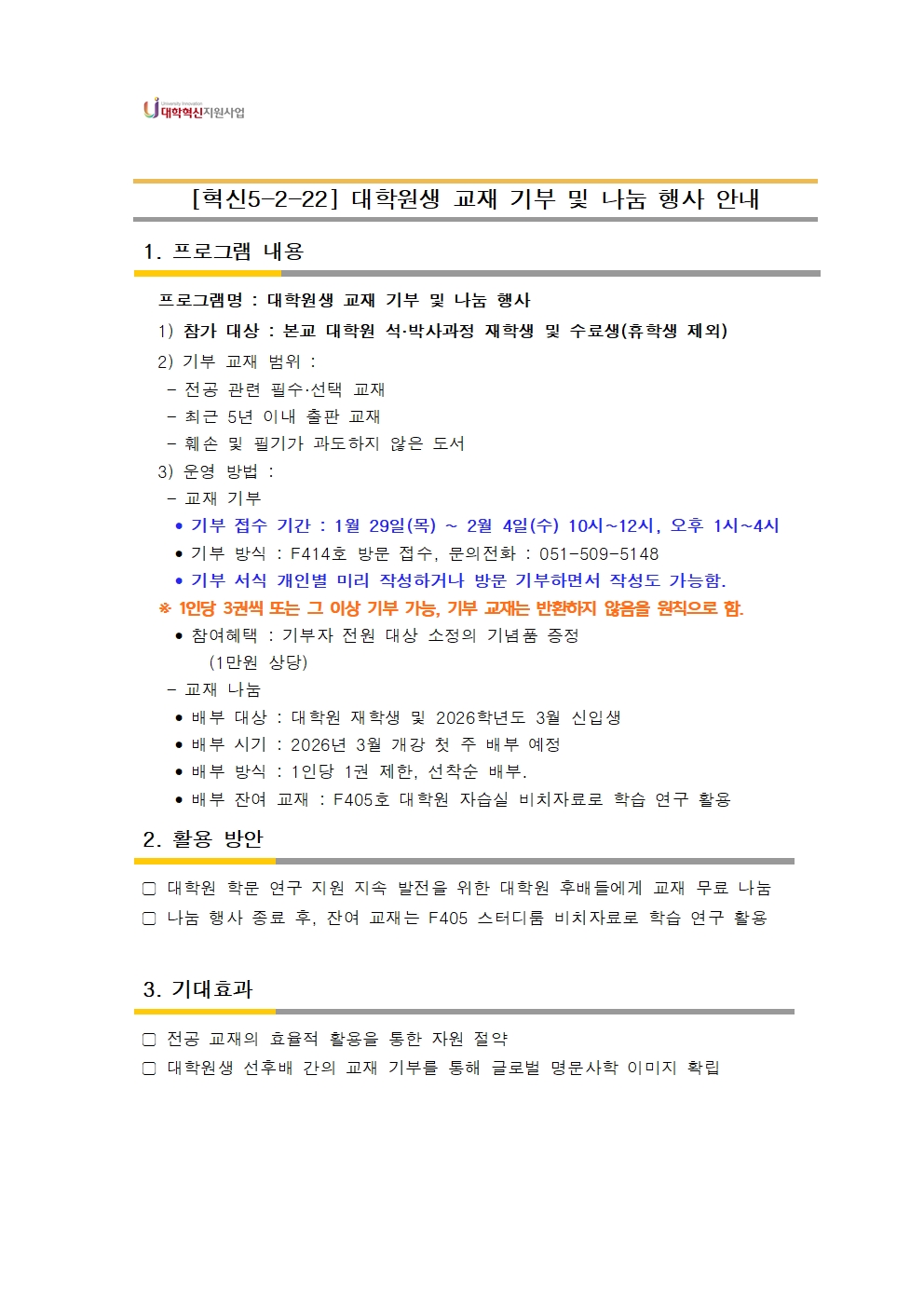 공지사항 [혁신5-2-22] 대학원생 연구 지원 - 대학원생 교재 기부 및 나눔 행사 참여 안내[서식 첨부파일 확인] 첨부파일[혁신5-2-22] 대학원생 연구 지원- 대학원 교재 기부 서식.pdf(86.6K)[혁신5-2-22] 대학원생 연구 지원- 대학원 교재 기부 서식.hwp(105.0K) 교육대학원관리자1일 전조회수10 목록2026년 상반기 울산광역시 대학…