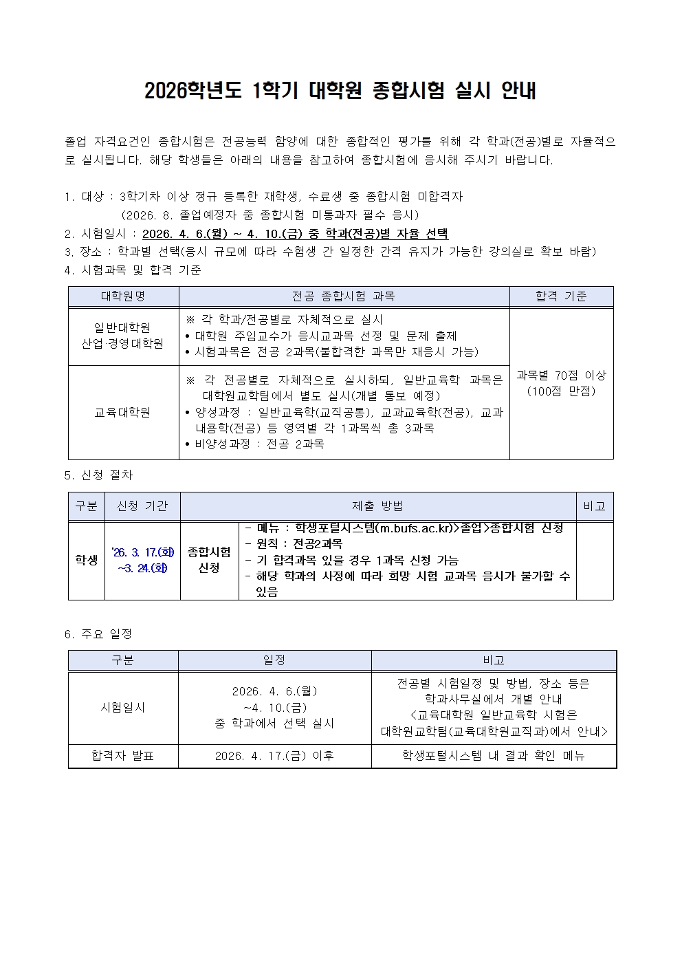 2026학년도 1학기 대학원 종합시험 실시 안내