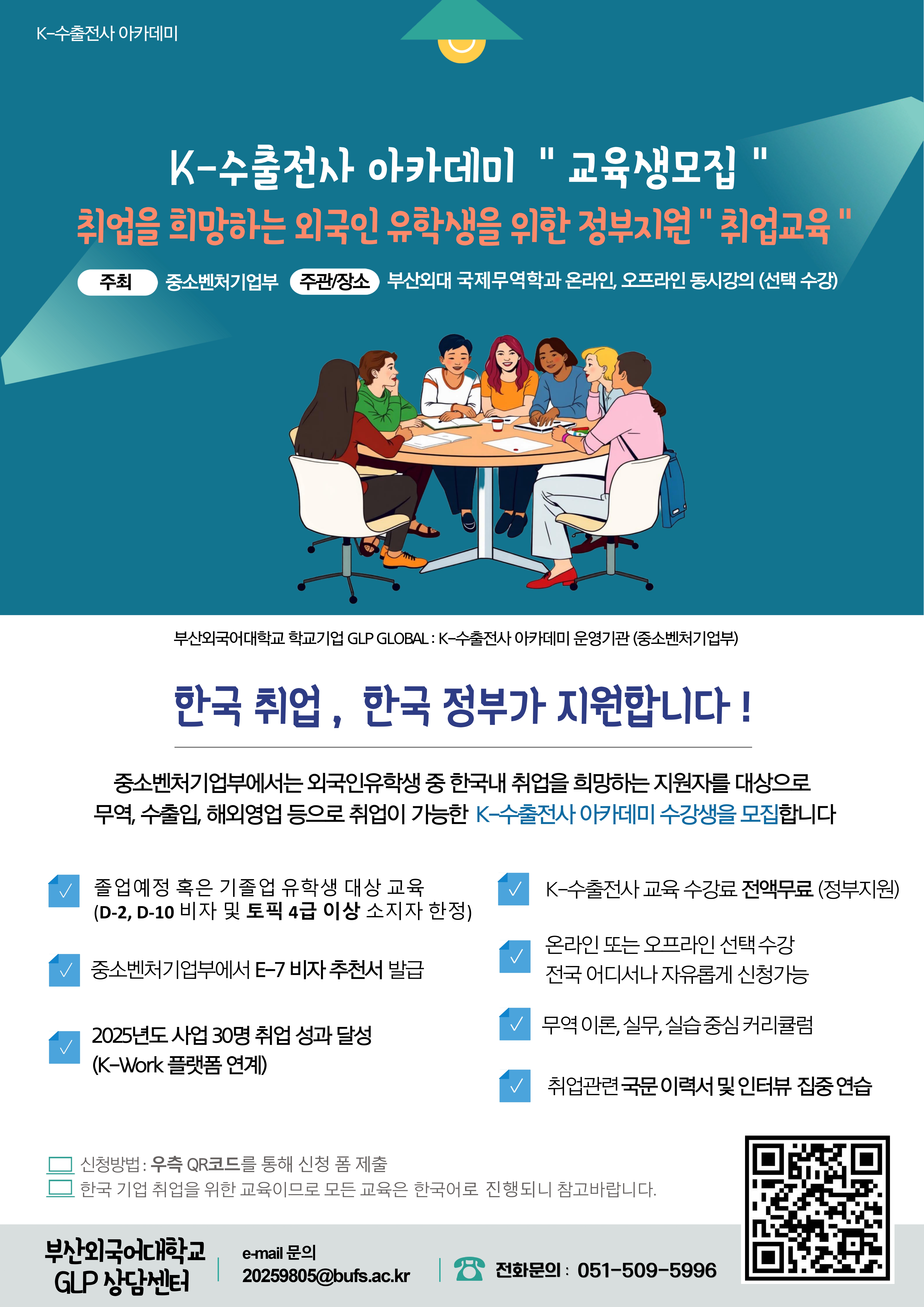 공지사항 대학원 석박사과정 졸업예정인 외국인 유학생 대상 K-수출전사 3기 모집 안내( 문의 전화 051-509-5996) 통역번역대학원관리자2026. 1. 8조회수56 2026학년도 전기 통역번역대학원…목록2025학년도 2학기 통역번역대학…