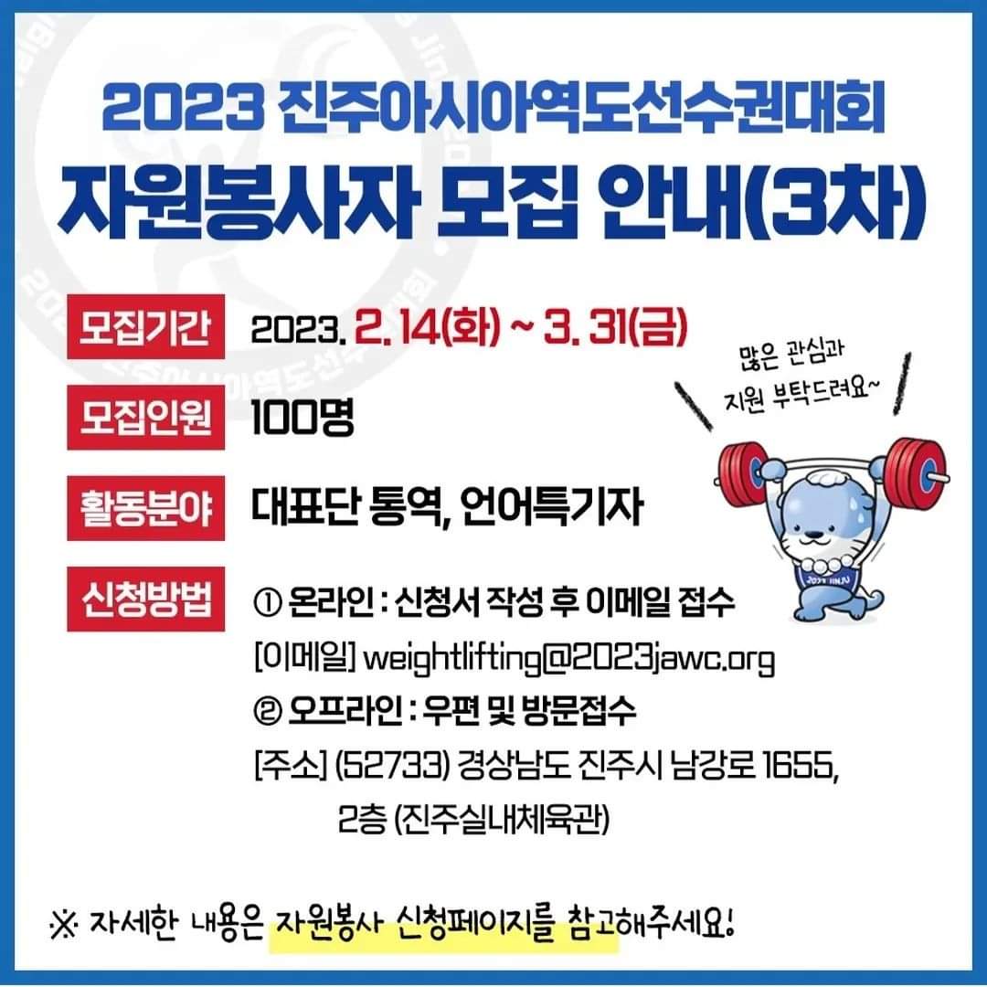 학과게시판 공지사항 2023 진주아시아역도선수권대회 아랍어 통역 자원봉사 모집 경남 진주시청에서 2023 진주아시아역도선수권대회 아랍어 통역 자원봉사원을 모집한다고 합니다. 많은 참여 부탁드립니다. 아랍학과관리자2023. 3. 9조회수1,123 0 등록된 댓글이 없습니다. 2023-1 특수외국어언어클리닉 …목록[특수외국어사업단] 2023 통번…