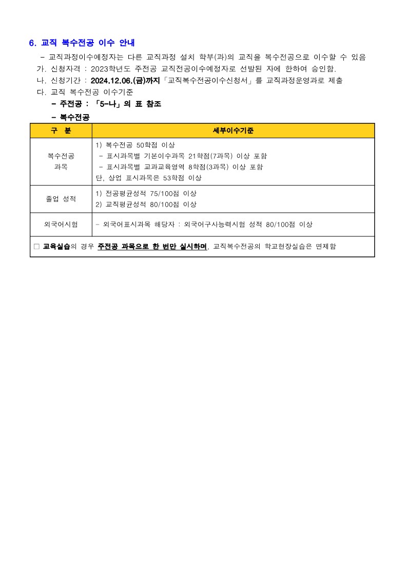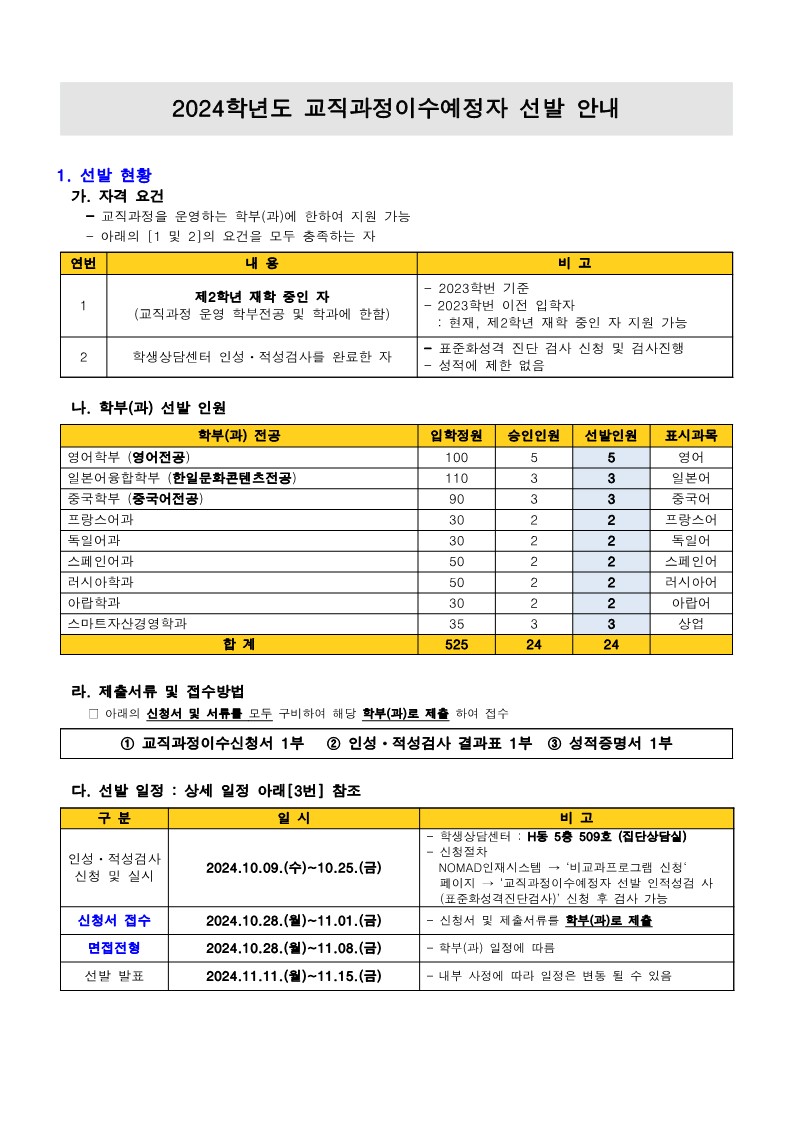 학과게시판 공지사항 2024학년도 교직과정이수예정자 선발 안내 첨부파일2. 공지 교직이수예정자선발.pdf(77.2K)3. 양식 교직과정 이수신청서2024학년도.hwp(16.5K) 아랍학과관리자2024. 10. 15조회수473 0 등록된 댓글이 없습니다. 2024학년도 2학기 PSC 전공…목록[뉴빌리티] 사우디아라비아 네옴시…