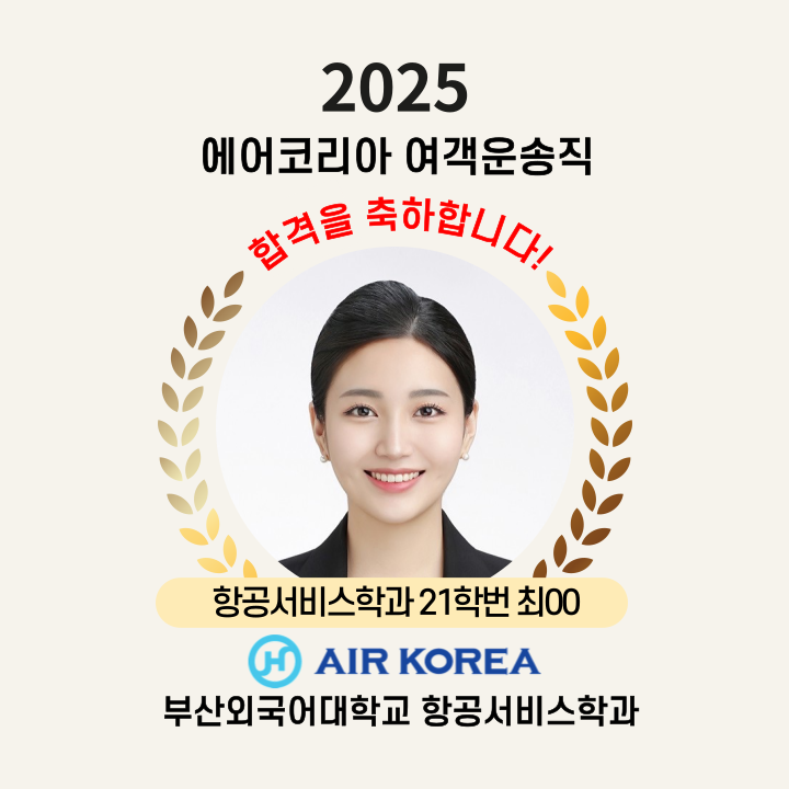 취업정보 취업명단 [지상직] 2025년 에어코리아 합격자 최OO 합격을 진심으로 축하드립니다.자랑스러운 부산외대인으로의 멋진 앞날을 기원합니다. 항공서비스학과관리자2025. 3. 31조회수452 0 등록된 댓글이 없습니다. 2025년 대한항공 객실승무원 채…목록2025년 싱가폴항공 객실승무원 …
