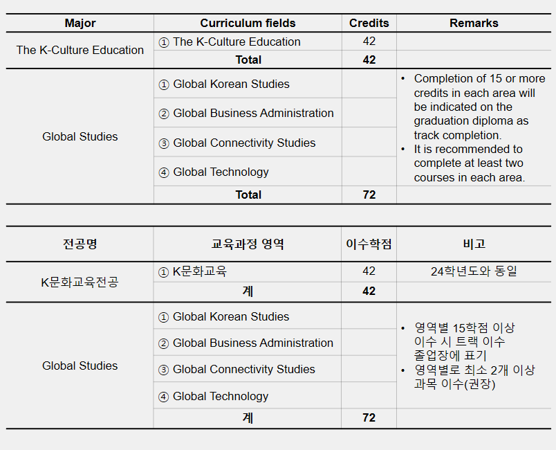 The Global Studies is an English-only curriculum offering a variety of academic courses including Global Korean Studies, Global Business Administration, Global Connectivity Studies, and Global Technology.The K-Culture Education is a Korean language-only curriculum for international students that trains international professionals well-versed in Korean language and culture, and provides various academic courses such as Korean studies, international studies, and interpretation and translation strategies.