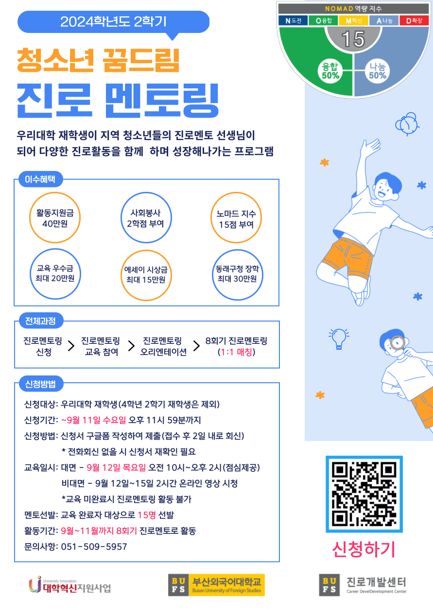 - 진로개발센터 진로멘토링 담당자: 051-509-5957