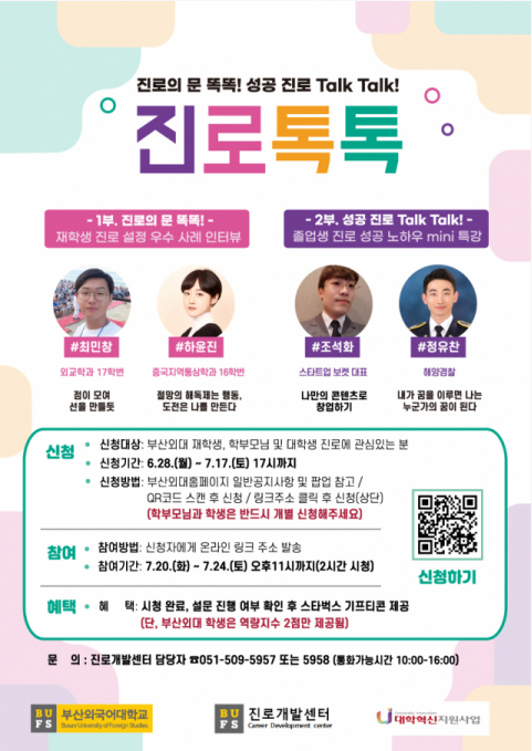 올해 제 2회를 맞는 비대면 진로캠프 ‘진로톡톡’은 오는 7월 20일부터 24일까지 부산외국어대학교 신입생, 학부모뿐만 아니라 대학생들의 진로에 관심이 있는 일반인까지 참여 대상을 넓혀 코로나19로 인해 힘든 시기에 꿈을 향한 의지를 북돋아주는 시간을 마련할 예정이다.