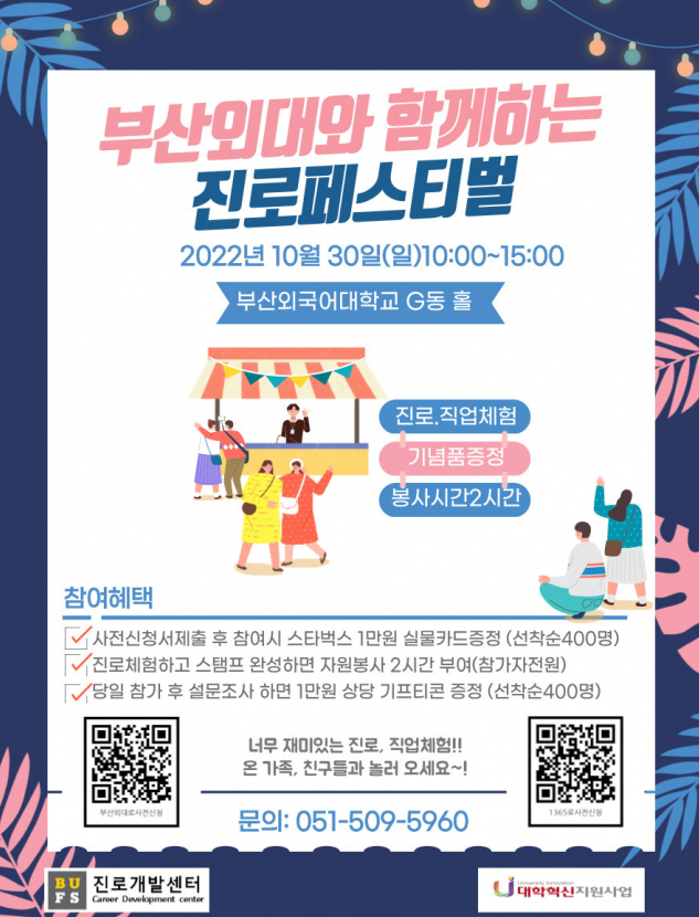 사전 신청은 포스터 QR코드를 통한 신청 또는 1365포털사이트에서 봉사참여-시간인증봉사-금정구 지역 '부산외국어대학교 진로페스티벌'로 검색하면 신청할 수 있다.