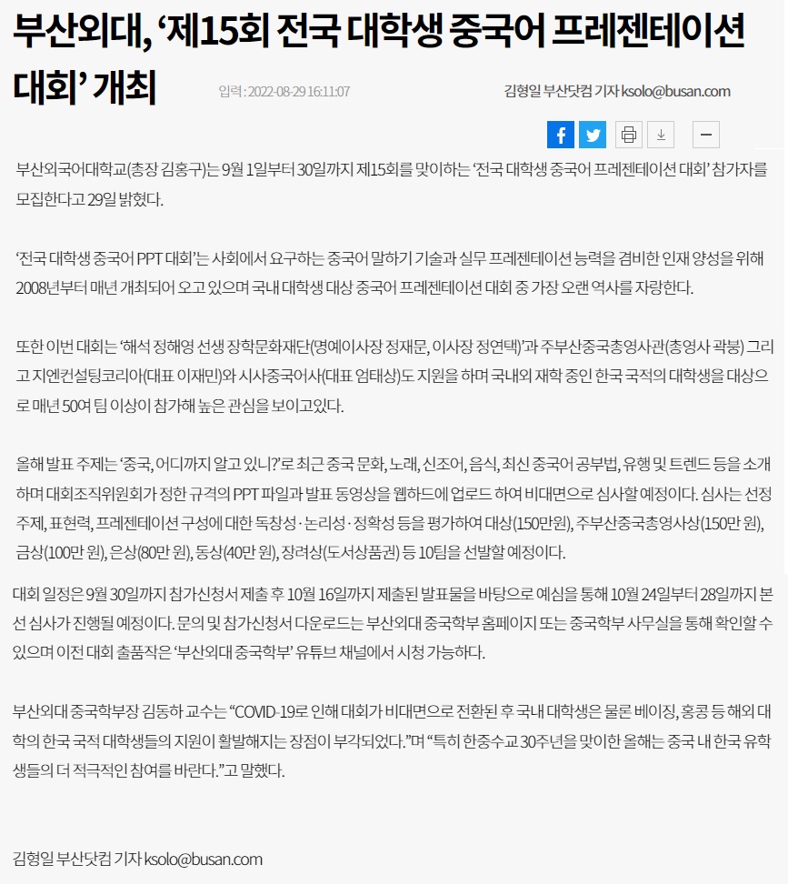대회 및 공모전 PPT 대회 공지사항 제15회 전국 대학생 중국어 PPT대회 언론보도(부산일보. 2022.8.29) 중국학부관리자2022. 9. 2조회수506 제15회 전국 대학생 중국어 PP…목록제15회 전국 대학생 중국어 PP…