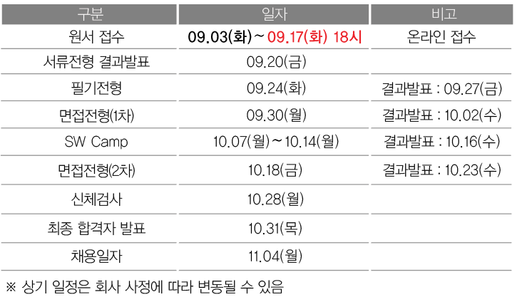 - 서류전형 → 필기전형* → 1차 면접전형 → SW Camp** → 2차 면접전형 → 신체검사 → 최종합격자 발표