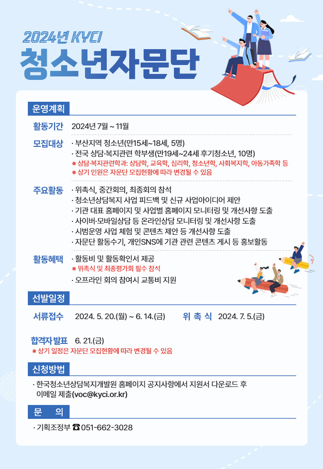 한국청소년상담복지개발원에서는 청소년의 눈높이에 맞게 사업 서비스를 개선하기 위해 청소년 자문단을 모집합니다.