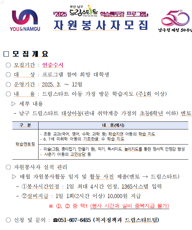 ※ 드림스타트사업이란? 취약계층 아동과 가족들에게 맞춤형 통합서비스를 제공하여 아동의 건강한 성장발달과 공평한 출발 기회를 제공함으로써 행복한 사회구성원으로 성장할 수 있도록 지원하는 사업으로 남구 드림스타트 아동을 대상으로 2025년도 학습멘토링 프로그램을 운영하기 위한 자원봉사자를 모집
