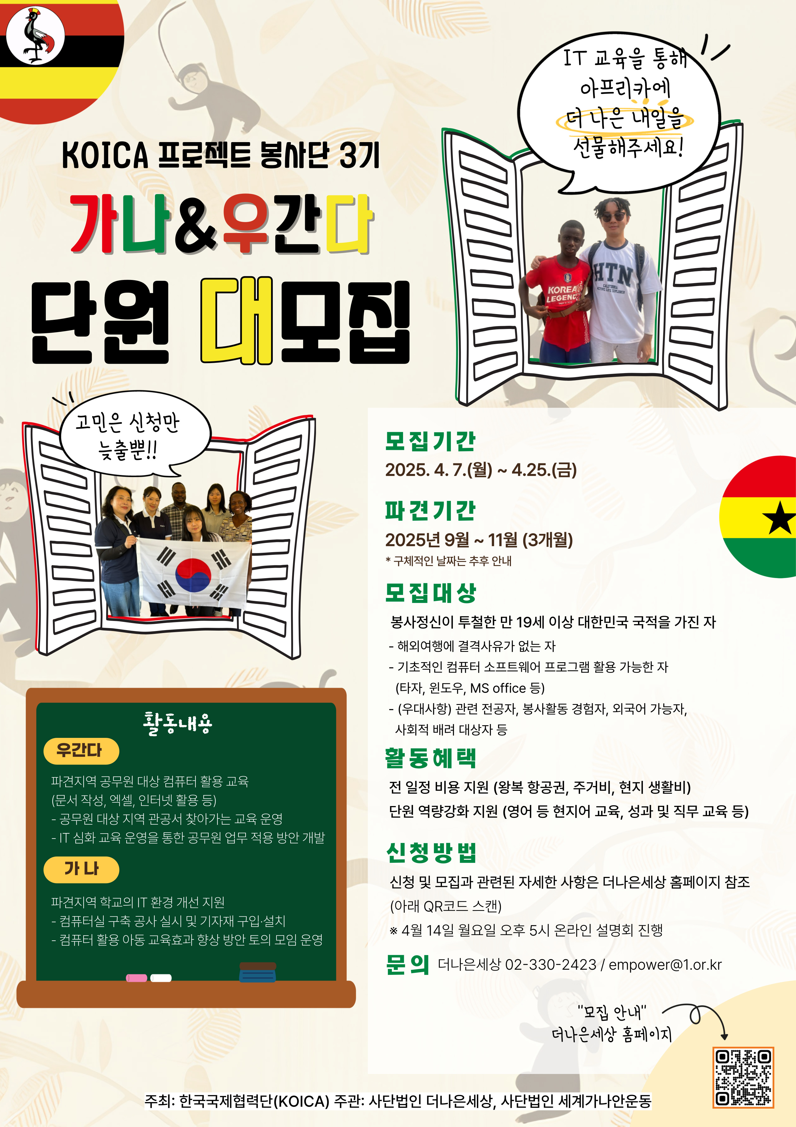 나. 파견지역/기간: 아프리카 가나ㆍ우간다/ 9월 ~ 11월 ※자세한 일정은 추후 공지