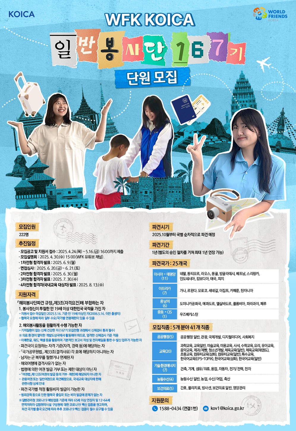 ◎ 「해외봉사단파견 규정」 제3조(자격요건)에 부합하는 자 · 봉사정신이 투철한 만 19세 이상 대한민국 국적을 가진 자 - 지원서 접수 마감일인 2025.5.16. 기준 만 19세 이상인 자(2006.5.16. 이전 출생자) - 협력국 요청에 따라 일부 수요/국가 연령 제한이 있을 수 있음 · 해외봉사활동을 원활하게 수행이 가능한 자 · 파견국이 요청하는 자격 기준(자격, 경력 등)에 해당하는 자 · 「국가공무원법」 제33조(결격사유) 각 호에 해당하지 아니하는 자 · 남자는 군 복무를 필했거나 면제된 자 ◎ 우리 정부와 파견국 출입국 관리기준 및 해외감염병 예방수칙 등에 부합하는 자 · 해외여행에 결격사유가 없는 자 · 법령에 의한 여권 발급 거부 또는 제한 대상이 아닌 자 · 파견 국가별 적정 활동비자 발급이 가능한 자 ※ 질병관리청 코로나19 예방접종 기준에 따라 65세 이상 연장자 및 12~64세 면역저하자·감염취약시설 구성원에 대한 코로나19 백신 접종을 권고하며, 파견 국가별 출국 요건에 따라 추후 코로나19 백신 접종이 필수 요구될 수 있음 |