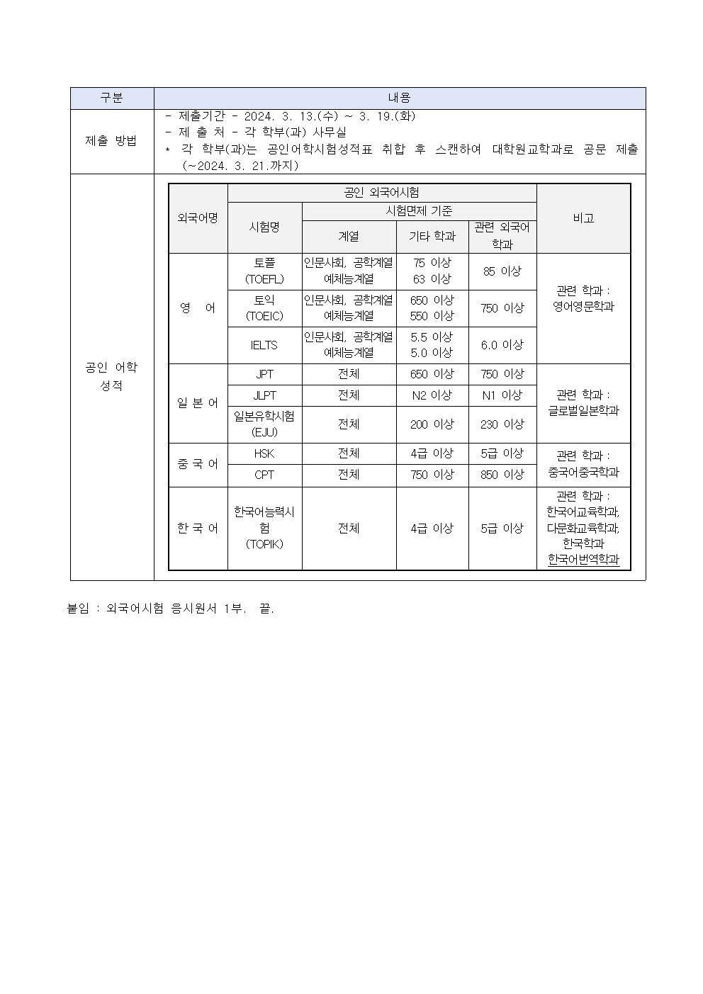 공지사항 2024학년도 1학기 대학원 학위청구논문 제출자격 외국어시험 시행 안내 첨부파일외국어시험 응시원서.hwp(28.5K)외국어시험 응시원서.pdf(46.1K) 교육대학원관리자2024. 3. 5조회수413 2024년 3월 12일(화) 개교…목록2024-1 학기 중 대학원 학습…