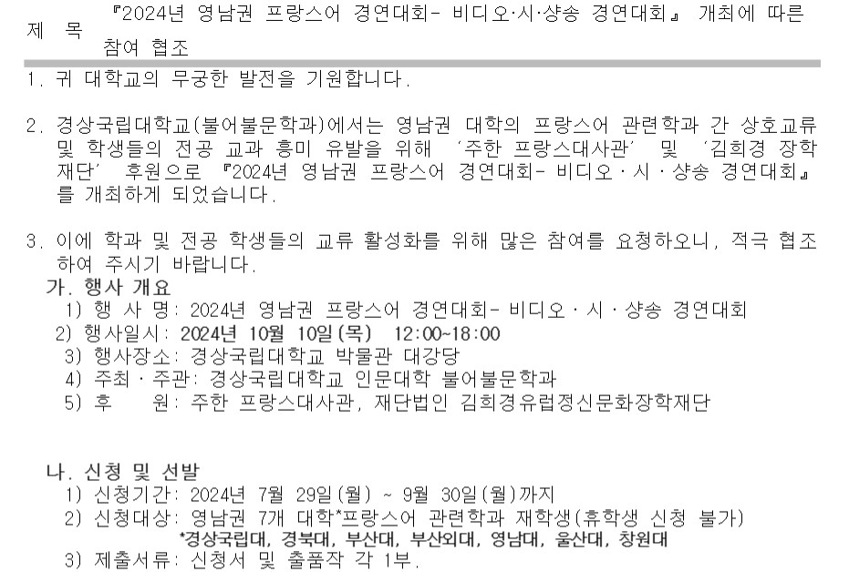 < 2024년 영남권 프랑스어 경연대회 - 비디오·시·샹송 경연대회 참여 모집 >