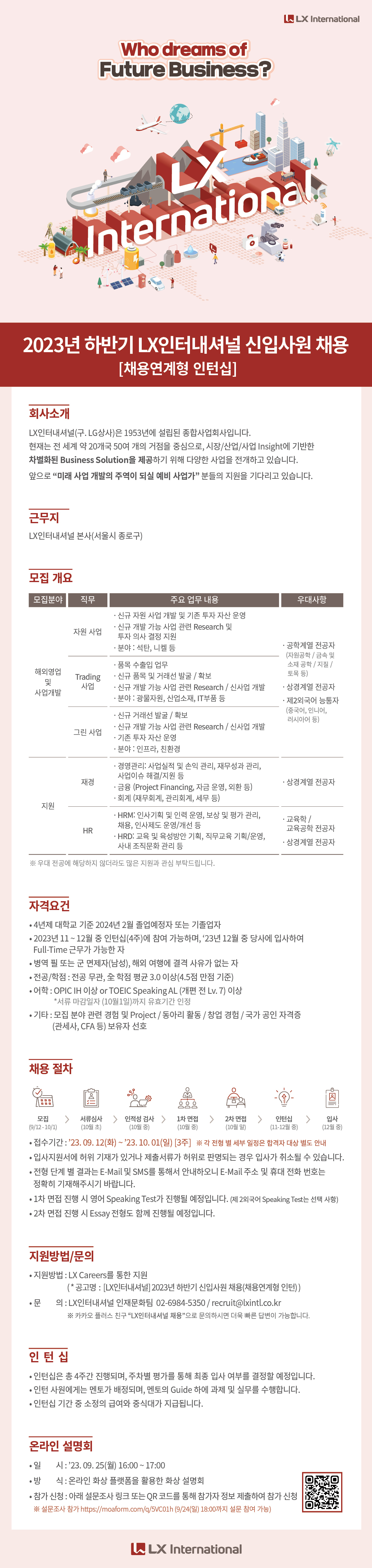 학과게시판 자료실 [채용공고] 2023년 하반기 LX 인터내셔널 신입사원 채용 프랑스어과관리자2023. 9. 19조회수511 0 등록된 댓글이 없습니다. 어학연수 장학생 선발 - …목록금정구 청년 구직응원 패키지 지원…