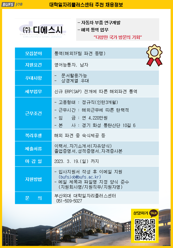 학과게시판 자료실 [채용정보] (주)디에스시 프랑스어과관리자2023. 3. 14조회수778 0 등록된 댓글이 없습니다. 2023학년도 1학기 진로탐색 교…목록2023 영마이스(Yong Mic…