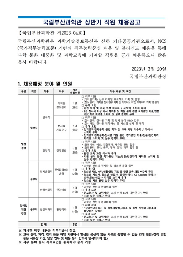 학과게시판 자료실 [채용공고] 국립부산과학관 상반기 직원 채용공고 첨부파일1. 2023년도 국립부산과학관 상반기 직원 채용공고.pdf(379.8K) 자세한 내용은 첨부파일 확인 바랍니다. 프랑스어과관리자2023. 3. 21조회수638 0 등록된 댓글이 없습니다. NCS 기반 공공기관/금융권 취업…목록2023 글로벌 셀러 청년 창업가…
