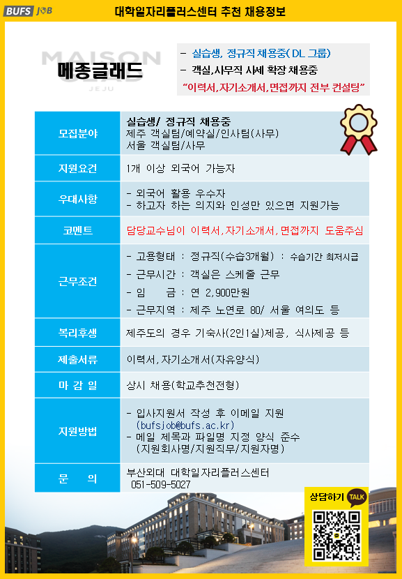 학과게시판 자료실 [채용정보] 메종글래드 프랑스어과관리자2023. 3. 28조회수676 0 등록된 댓글이 없습니다. 부산관광공사 관광분야 취·창업 교…목록BUFS 재학생 블로그기자단 1기…