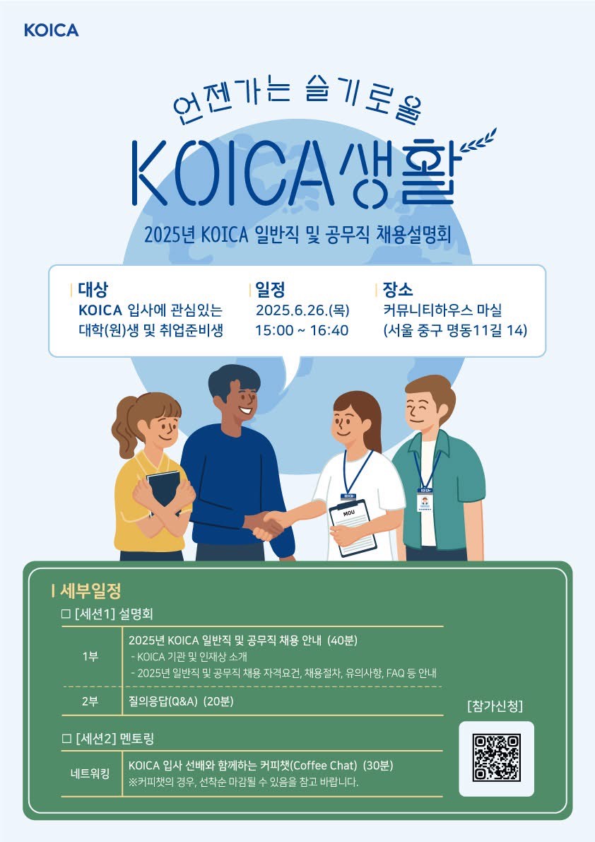 코이카가 2025년 공개 채용을 통해 국제개발협력으로 인류 공영과 세계평화 증진에 기여할 직원✨을 선발합니다.