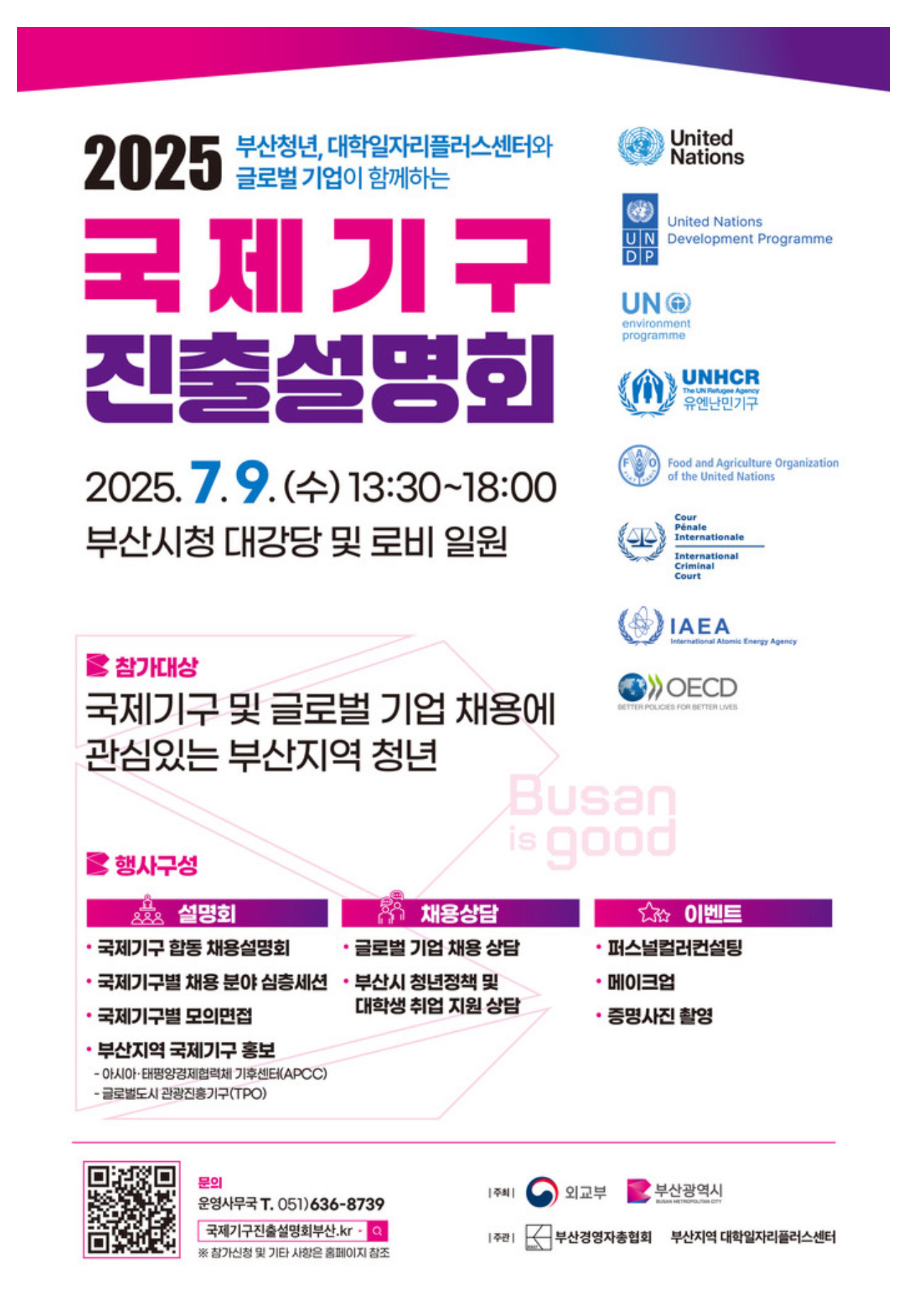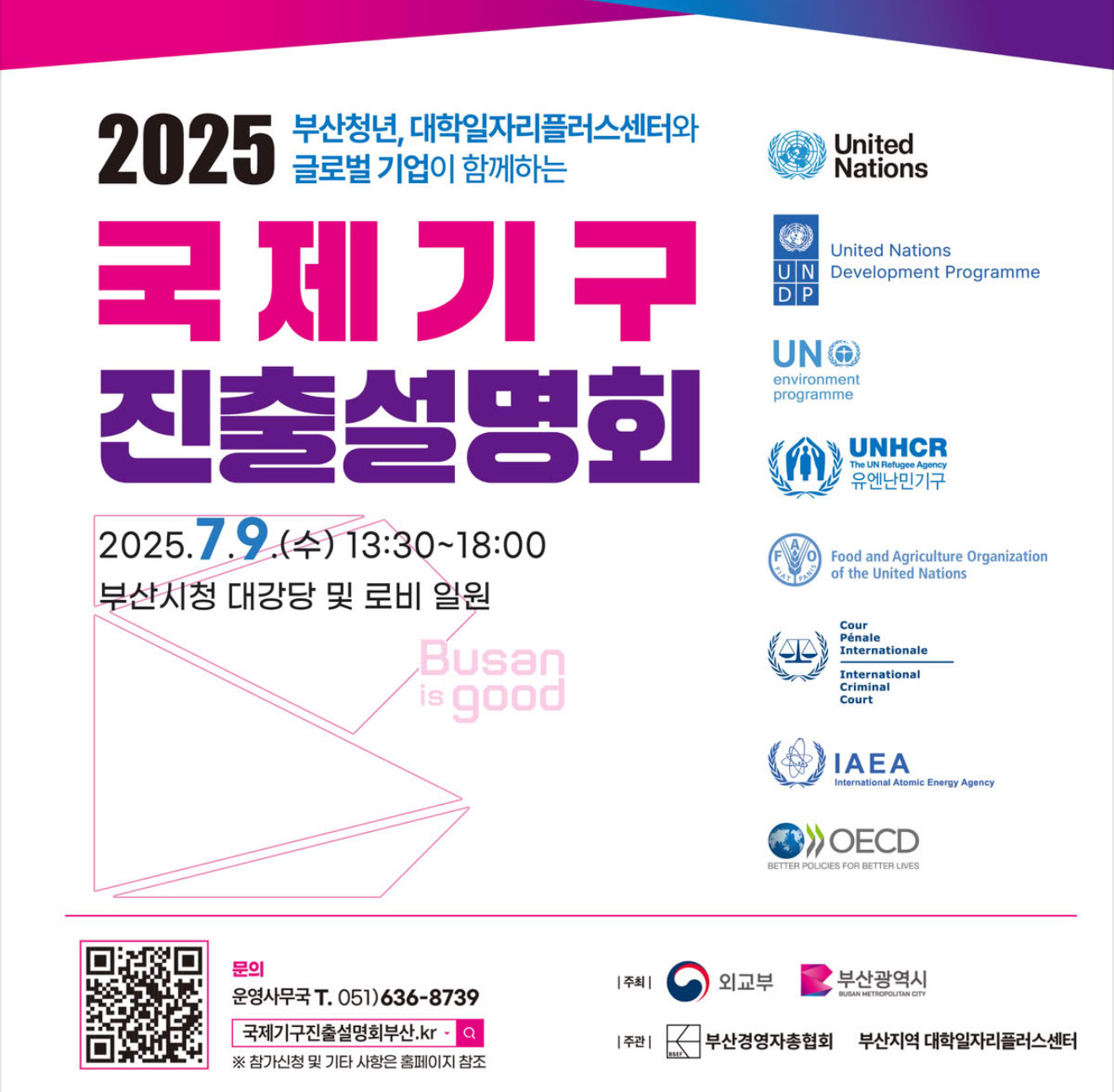2025 국제기구 진출설명회는 유엔사무국(UN), 유엔환경계획(UNEP)등 8개의 국제기구와 글로벌 기업이 함께합니다.