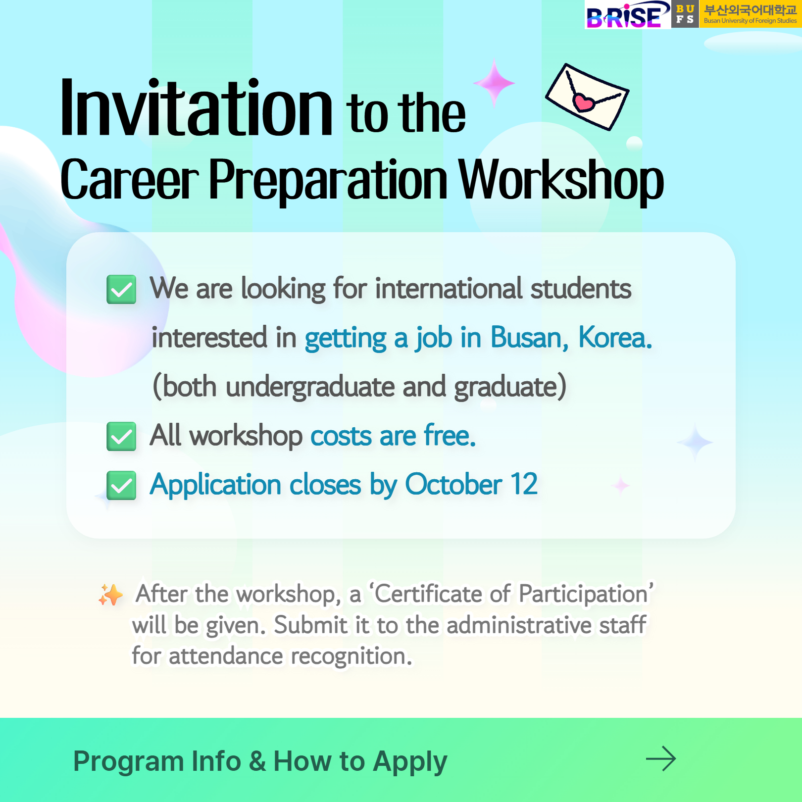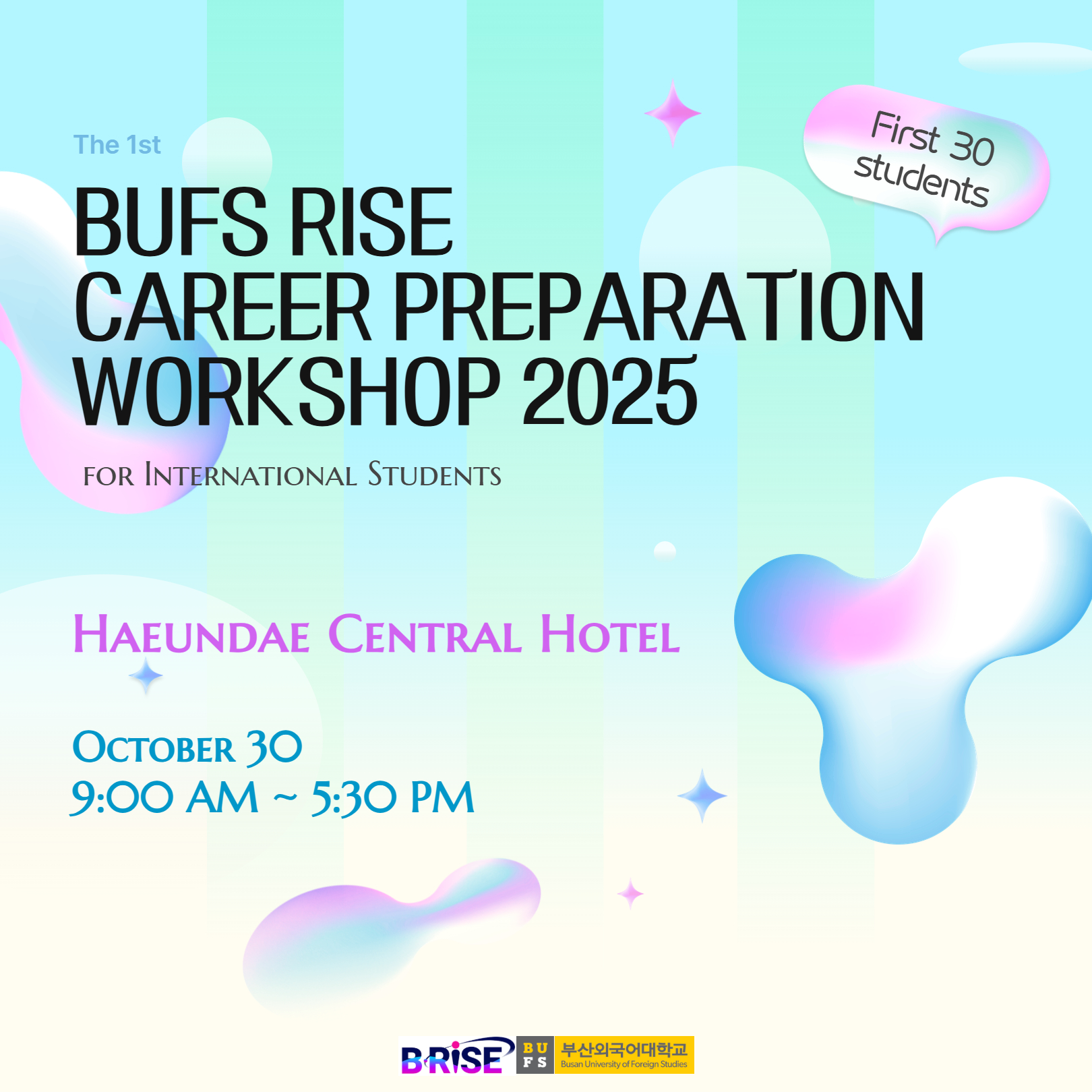 공지사항 The 1st BUFS RISE CAREER PREPARATION WORKSHOP 2025 FOR INTERNATIONAL S… 산업경영대학원관리자2025. 10. 1조회수93 2026학년도 전기 대학원 입시 …목록제1차 BUFS RISE 국제학생…