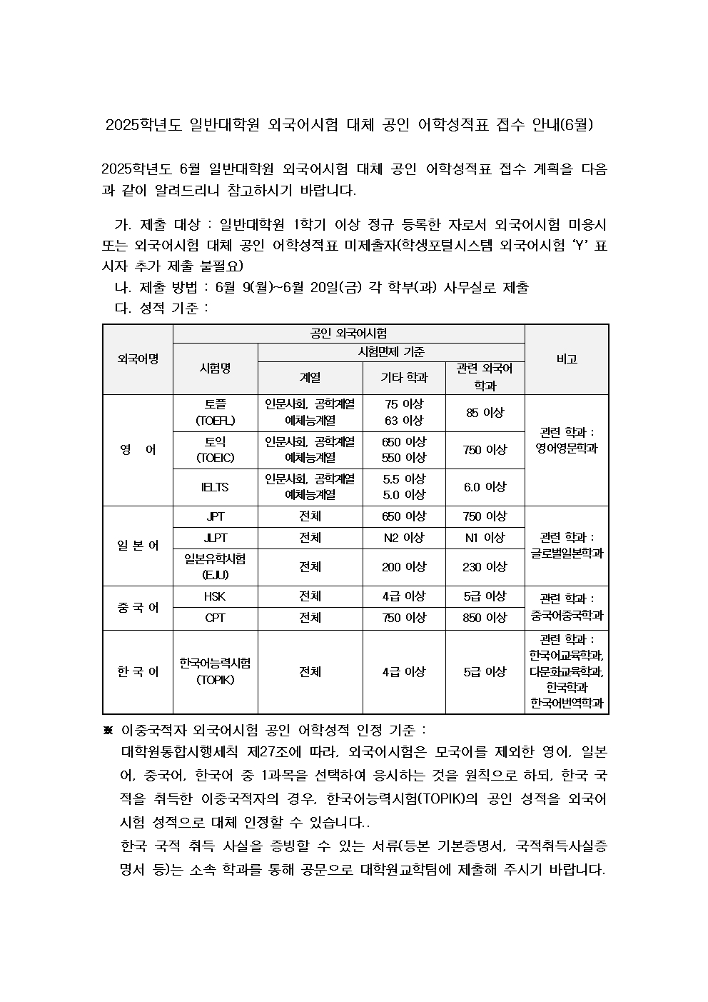 공지사항 2025학년도 일반대학원 외국어시험 대체 공인 어학성적표 접수 안내(6월) 일반대학원관리자2025. 6. 9조회수233 2025학년도 2학기 일반대학원 …목록2025학년도 후기 대학원 최초모…
