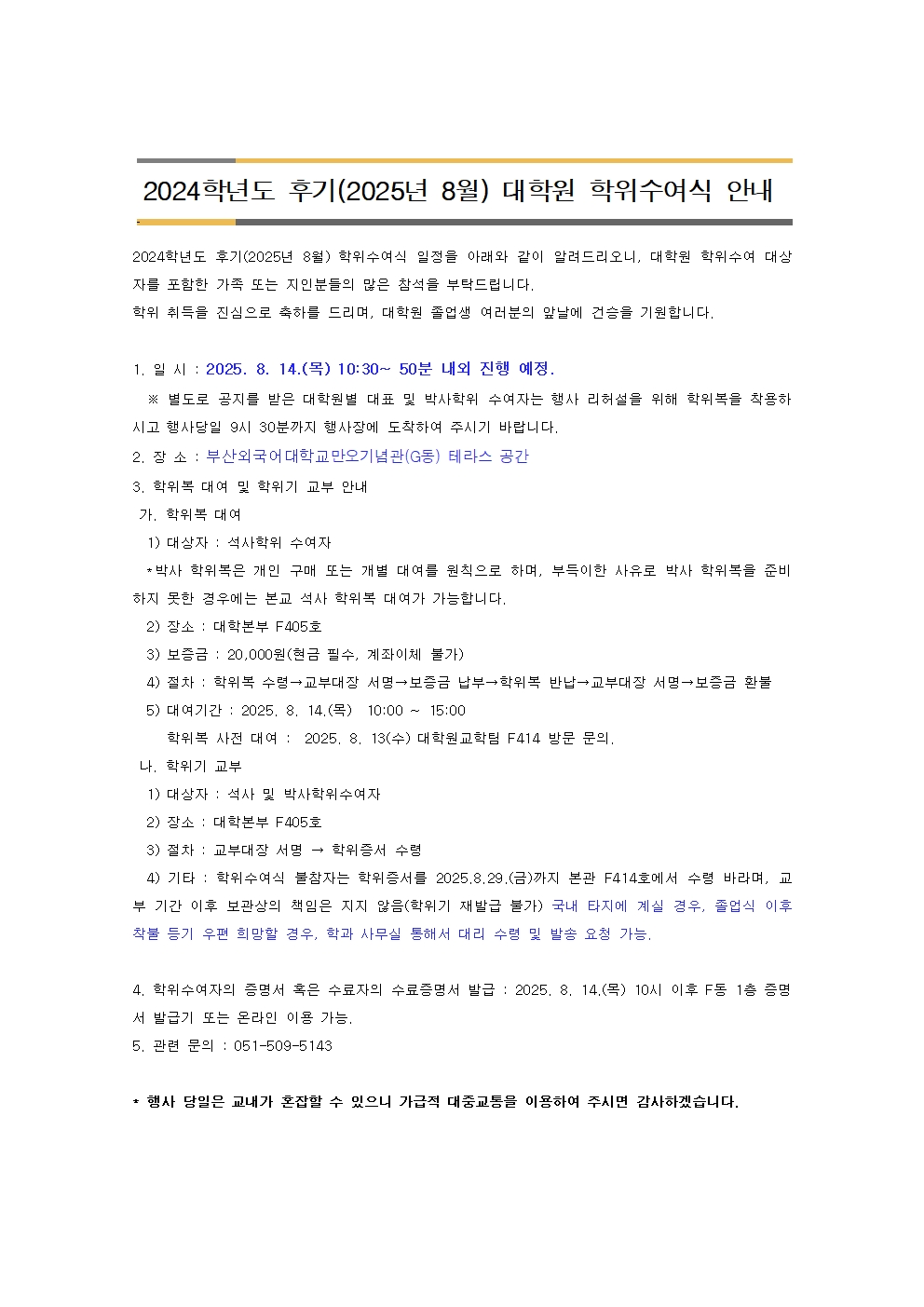 공지사항 2024학년도 후기(2025년 8월) 대학원 학위수여식 안내 도서관 5년간 무료 이용 안내 일반대학원관리자2025. 7. 25조회수559 2025학년도 2학기 신입생 등록…목록대학원 외국인 유학생 2025년도…