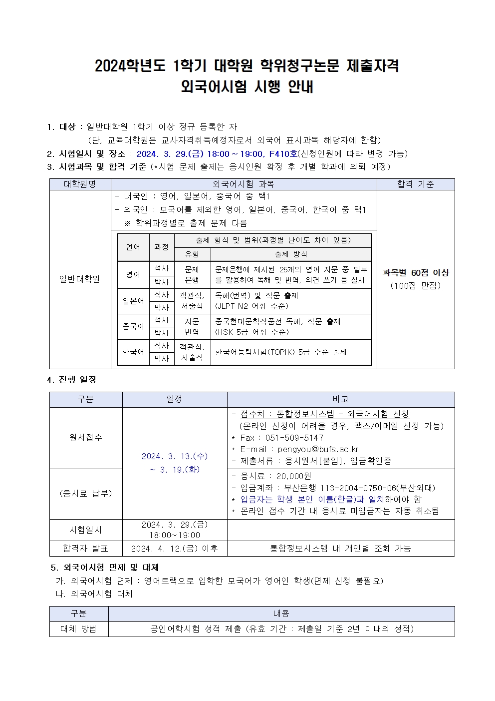 공지사항 2024학년도 1학기 대학원 학위청구논문 제출자격 외국어시험 시행 안내 첨부파일외국어시험 응시원서.hwp(28.5K)외국어시험 응시원서.pdf(46.1K) 일반대학원관리자2024. 3. 5조회수799 2024년 3월 12일(화) 개…목록2024-1 학기 중 대학원 학습…