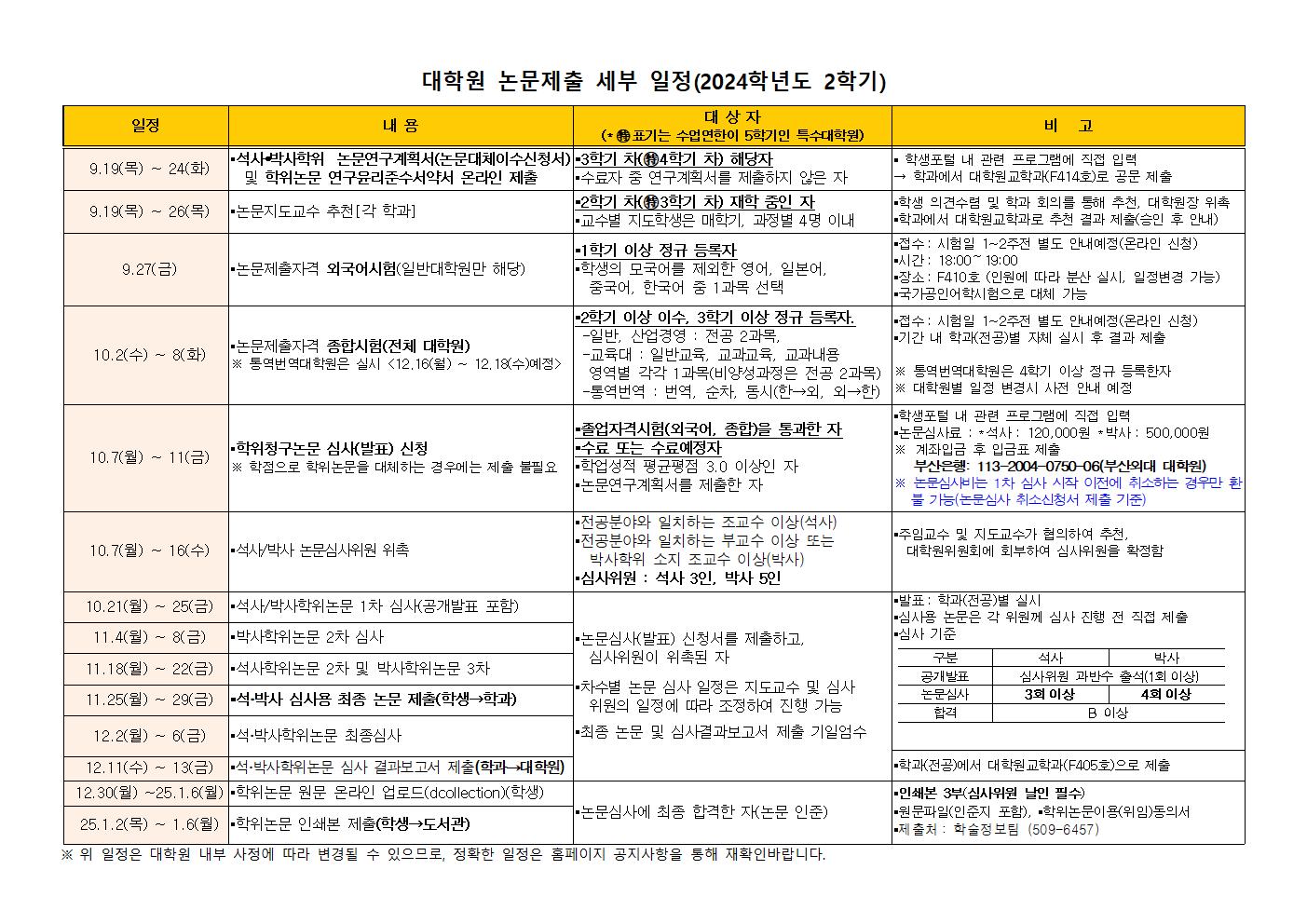 공지사항 2024학년도 2학기 대학원 논문제출 세부일정 안내(최종) 일반대학원관리자2024. 5. 17조회수821 2024학년도 후기 대학원 최초모…목록2024학년도 2학기 대학원 학사…