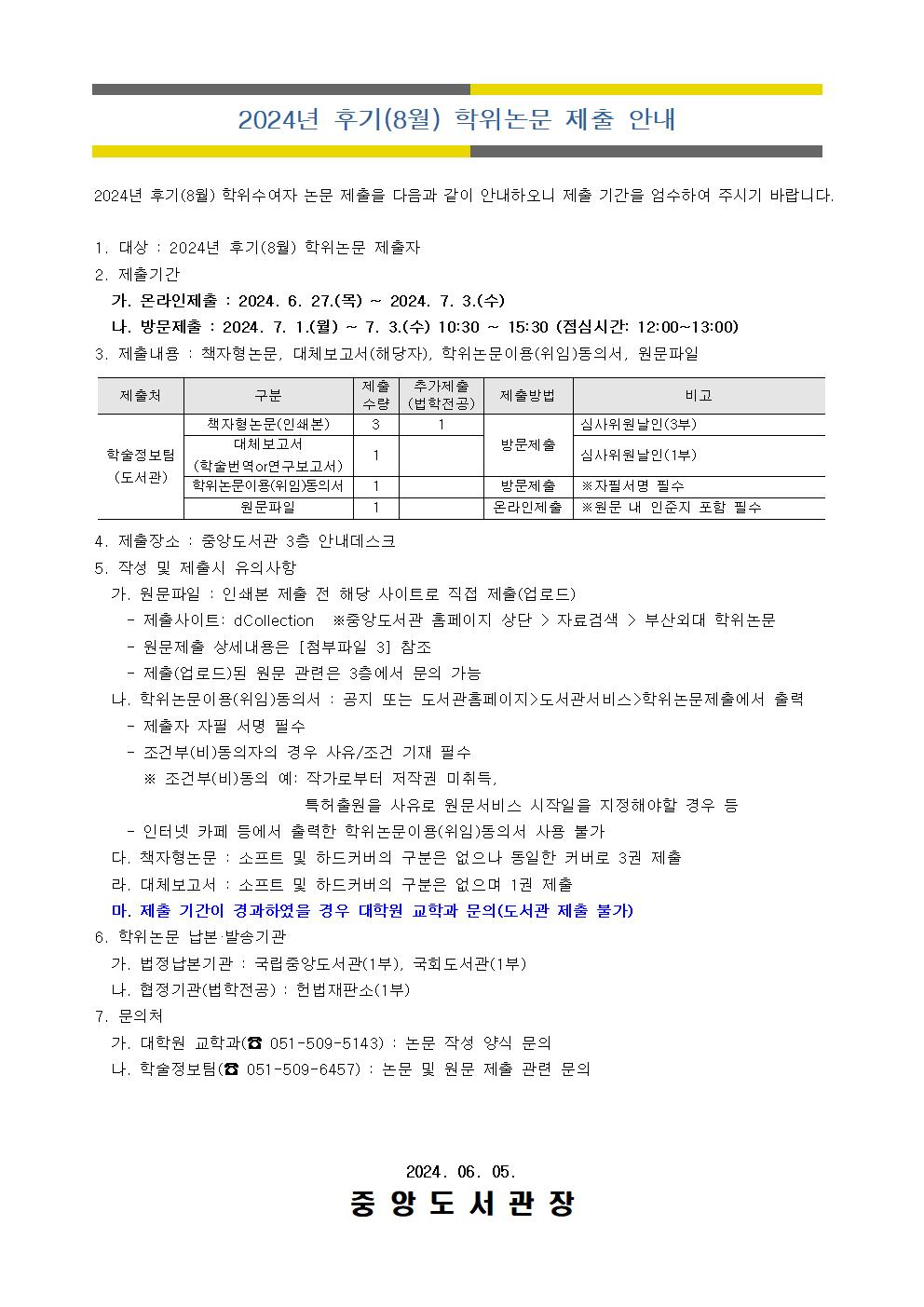 공지사항 2024년 후기(8월) 학위논문 제출 안내 첨부파일학위논문 온라인 제출 매뉴얼.pdf(2.1M)학위논문 이용위임동의서.hwp(164.5K) 학위논문 온라인 제출 매뉴얼, 학위논문 이용위임동의서 상단 첨부 파일 참조 일반대학원관리자2024. 6. 7조회수731 2024학년도 후기 대학원 최초모…목록현충일(6월 6일) 전체 수업 …