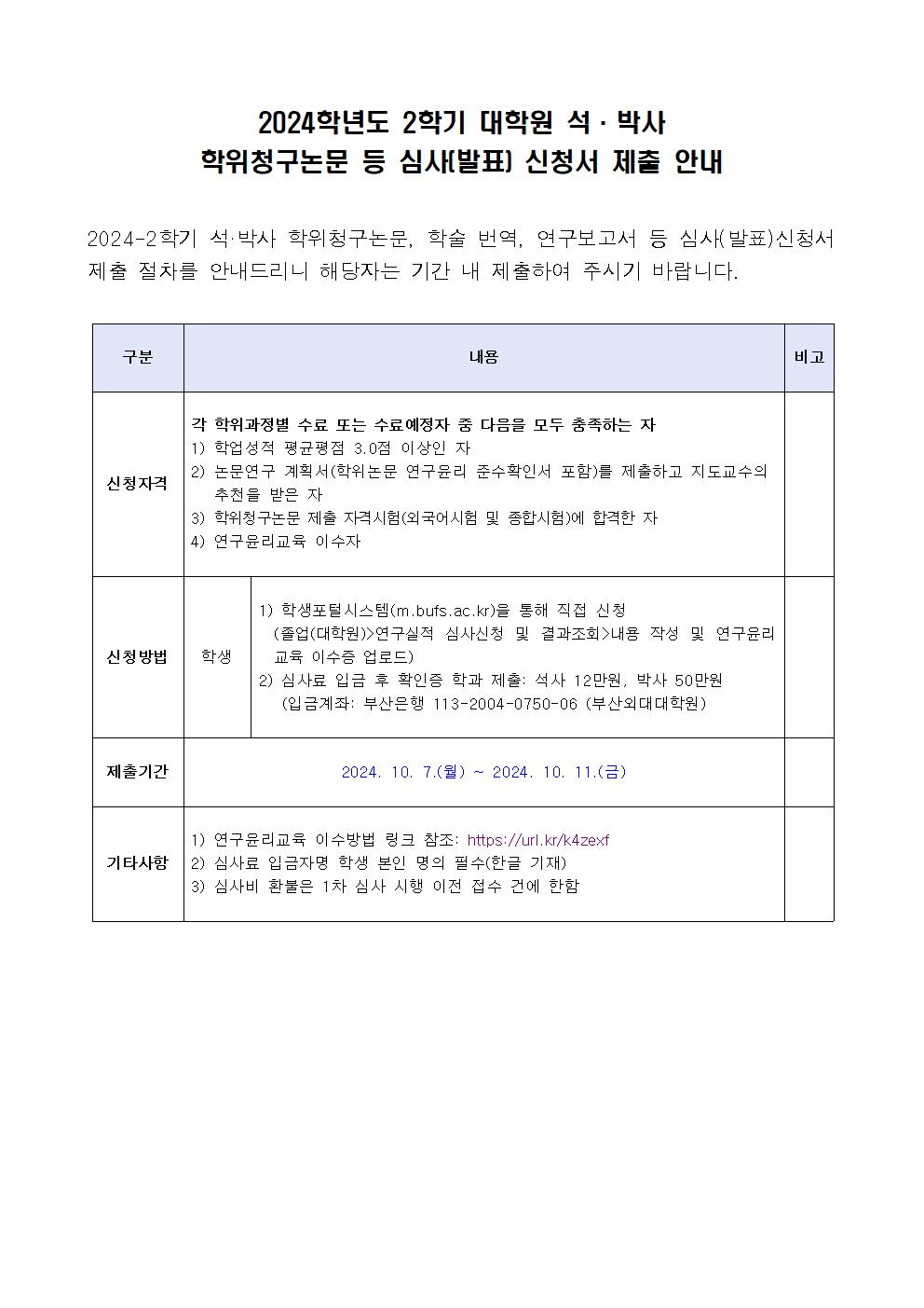 공지사항 2024학년도 2학기 학위청구논문, 학술 번역, 연구보고서 등 심사(발표) 신청서 제출 안내 온라인 연구윤리 일반대학원관리자2024. 10. 2조회수655 2025학년도 전기 대학원 입시 …목록[부산외국어대학교] 대학 방문형 …
