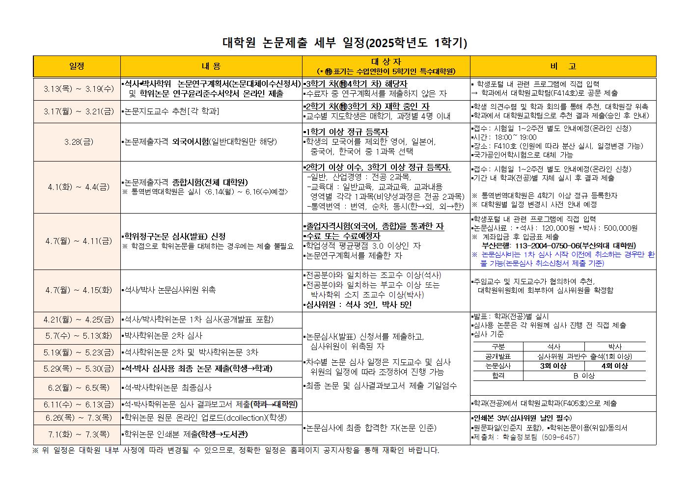 2025학년도 1학기 대학원 논문제출 세부 일정