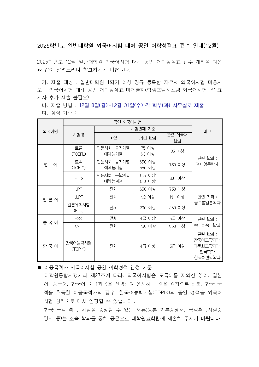 공지사항 2025학년도 일반대학원 외국어시험 대체 공인 어학성적표 접수 안내(12월) 일반대학원관리자2025. 12. 9조회수244 2026학년도 1학기 대학원 학…목록2026학년도 1학기 일반대학원 …