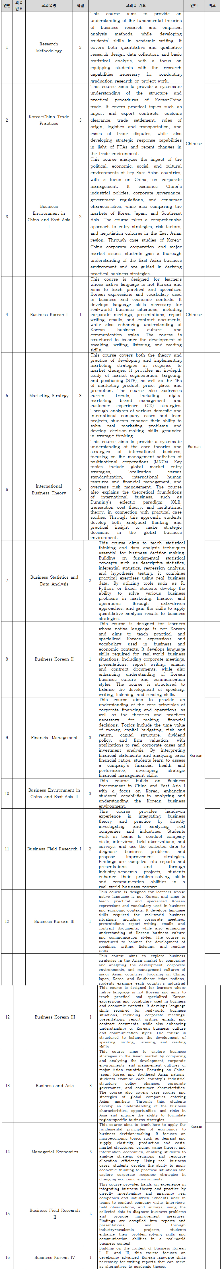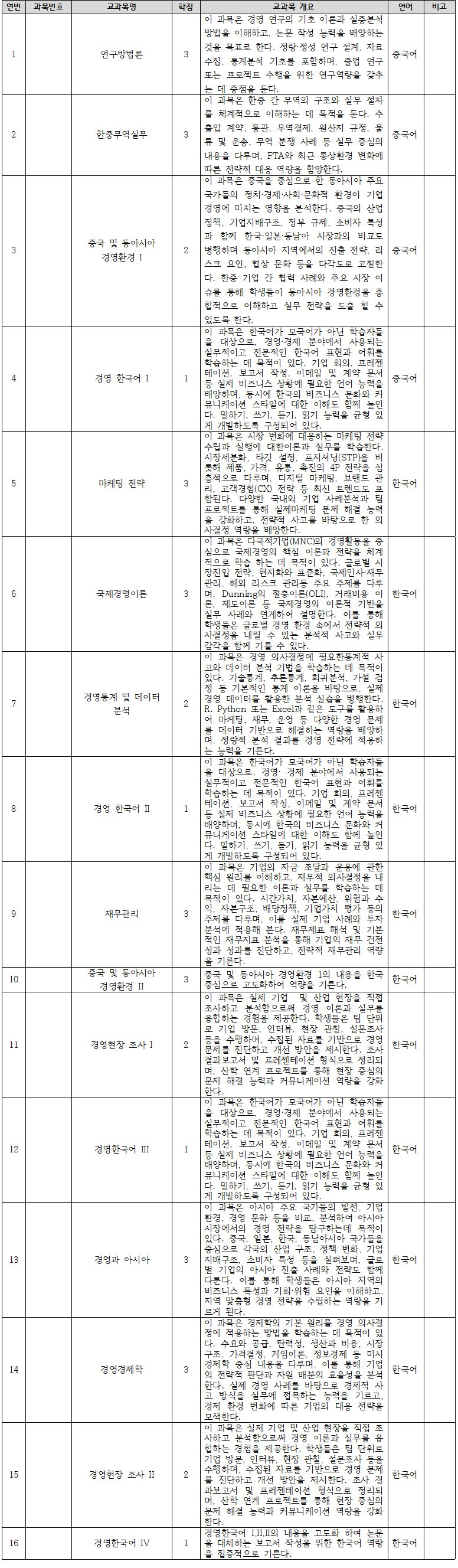 • 글로벌 경영 역량 강화 : 중국과 한국을 포함한 다양한 국제 시장에 대해 심도 있는 분석과 전략 수립 능력을 배양.