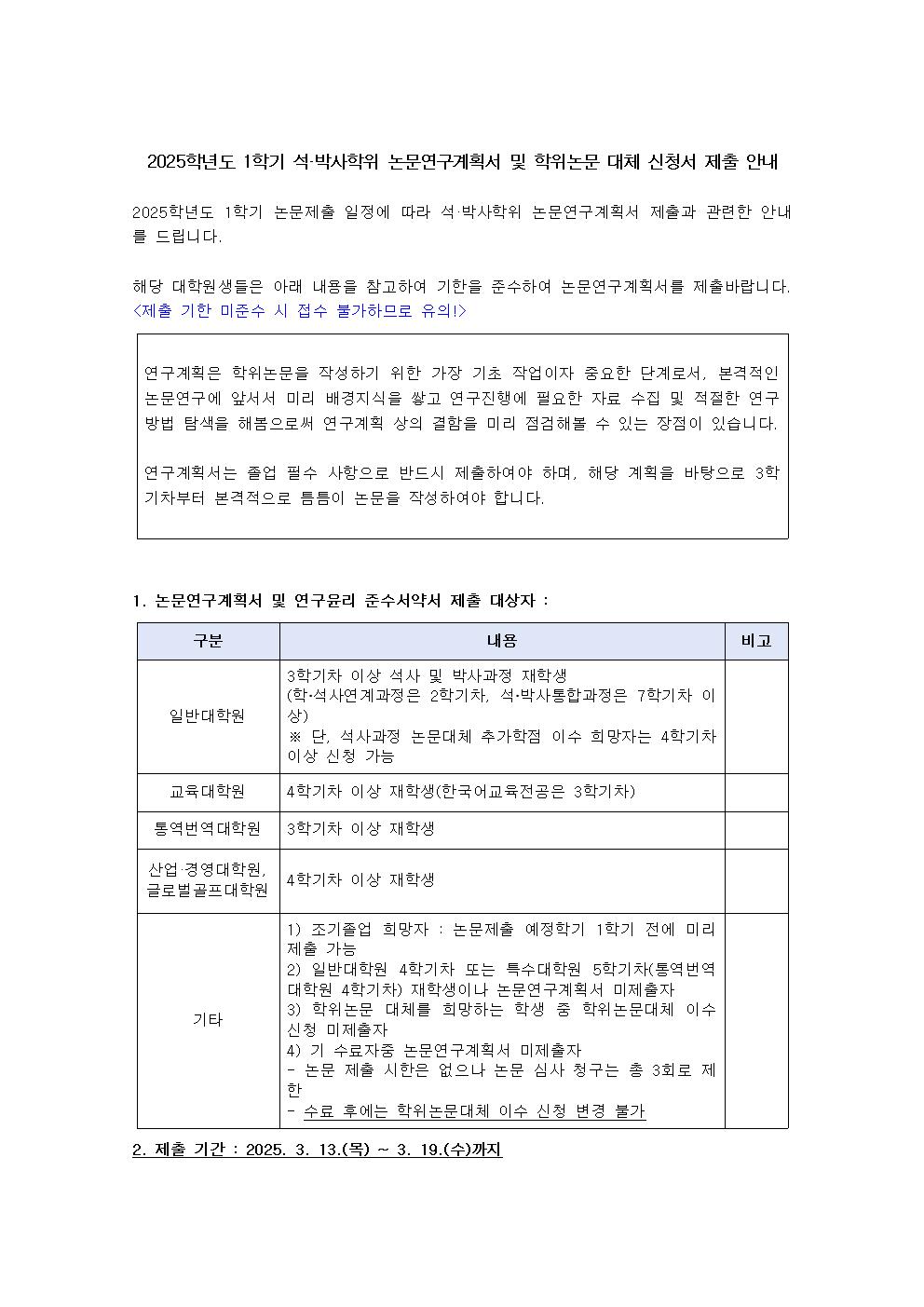 공지사항 2025학년도 1학기 석·박사학위 논문연구계획서 및 학위논문 대체 신청서 제출 안내 첨부파일[붙임1]석사학위청구논문대체신청서.hwp(56.0K) 통역번역대학원관리자2025. 3. 11조회수471 2025학년도 1학기 대학원 석·…목록2025학년도 1학기 동시통역실 …