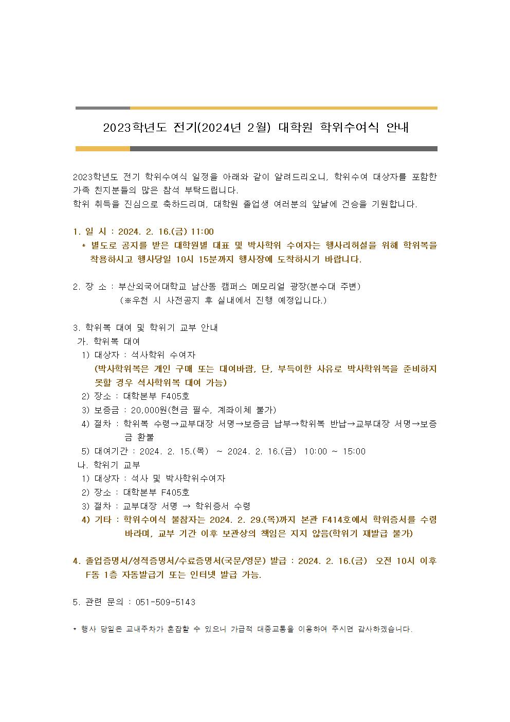 공지사항 2023학년도 전기(2024년 2월) 대학원 학위수여식 안내 통역번역대학원관리자2024. 2. 7조회수557 2024학년도 1학기 수강신청 및…목록2024전기 대학원 추가모집 합격…
