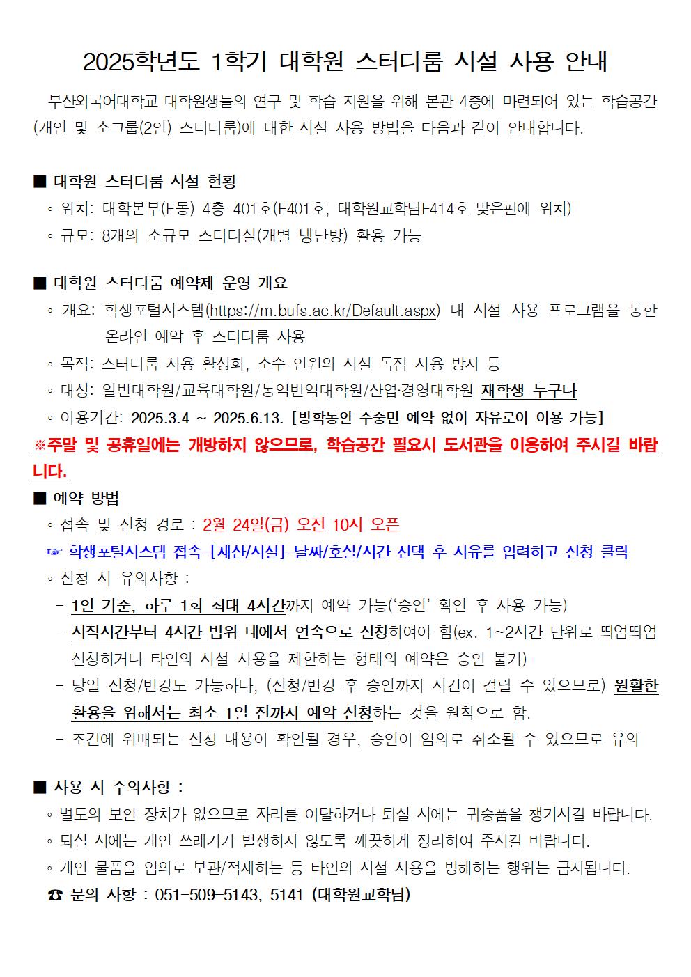 공지사항 2025학년도 1학기 대학원 스터디룸 시설 사용 안내 통역번역대학원관리자2025. 3. 5조회수280 개교기념일(3월 12일) 전체 수…목록부산외국어대학교 모바일 학생증 사…