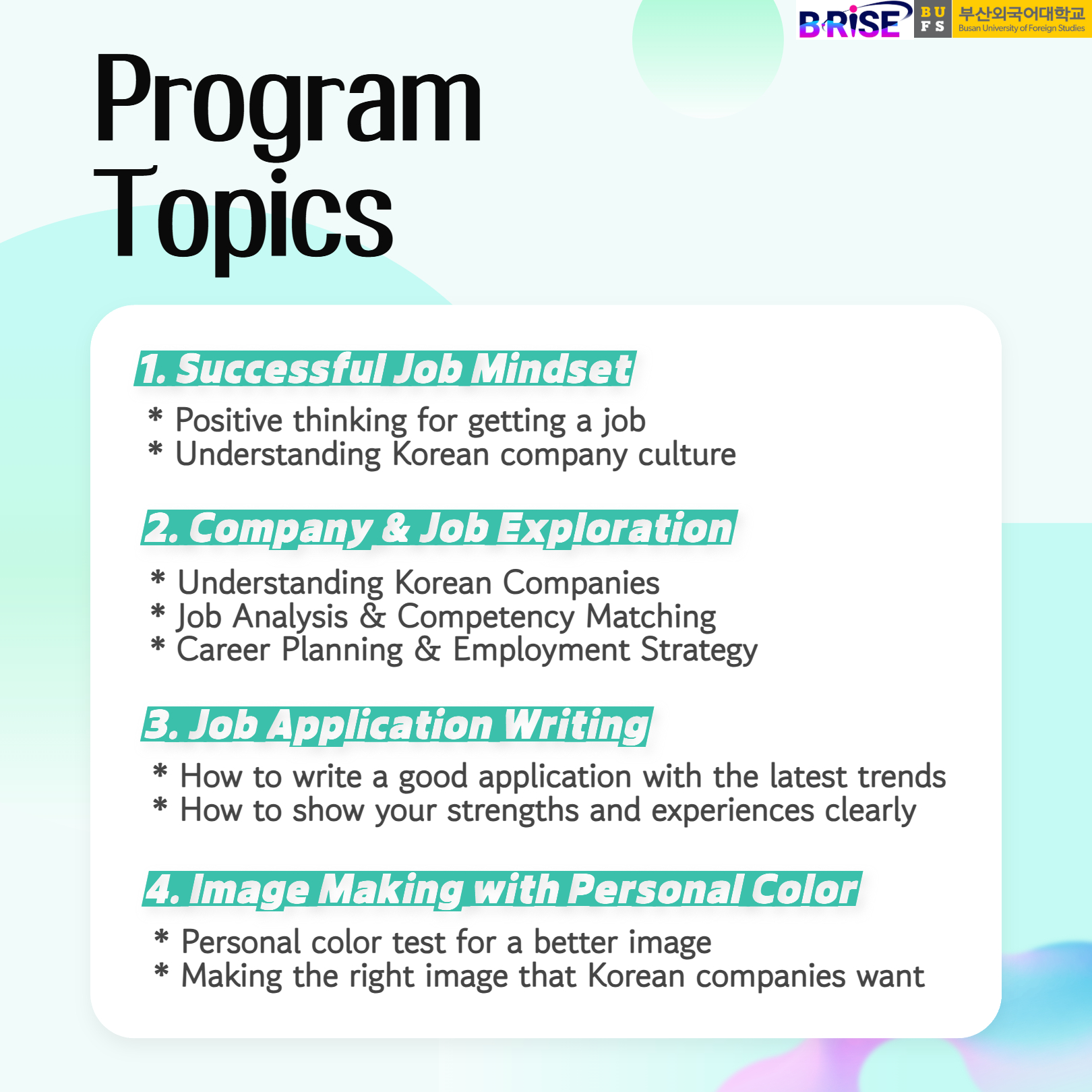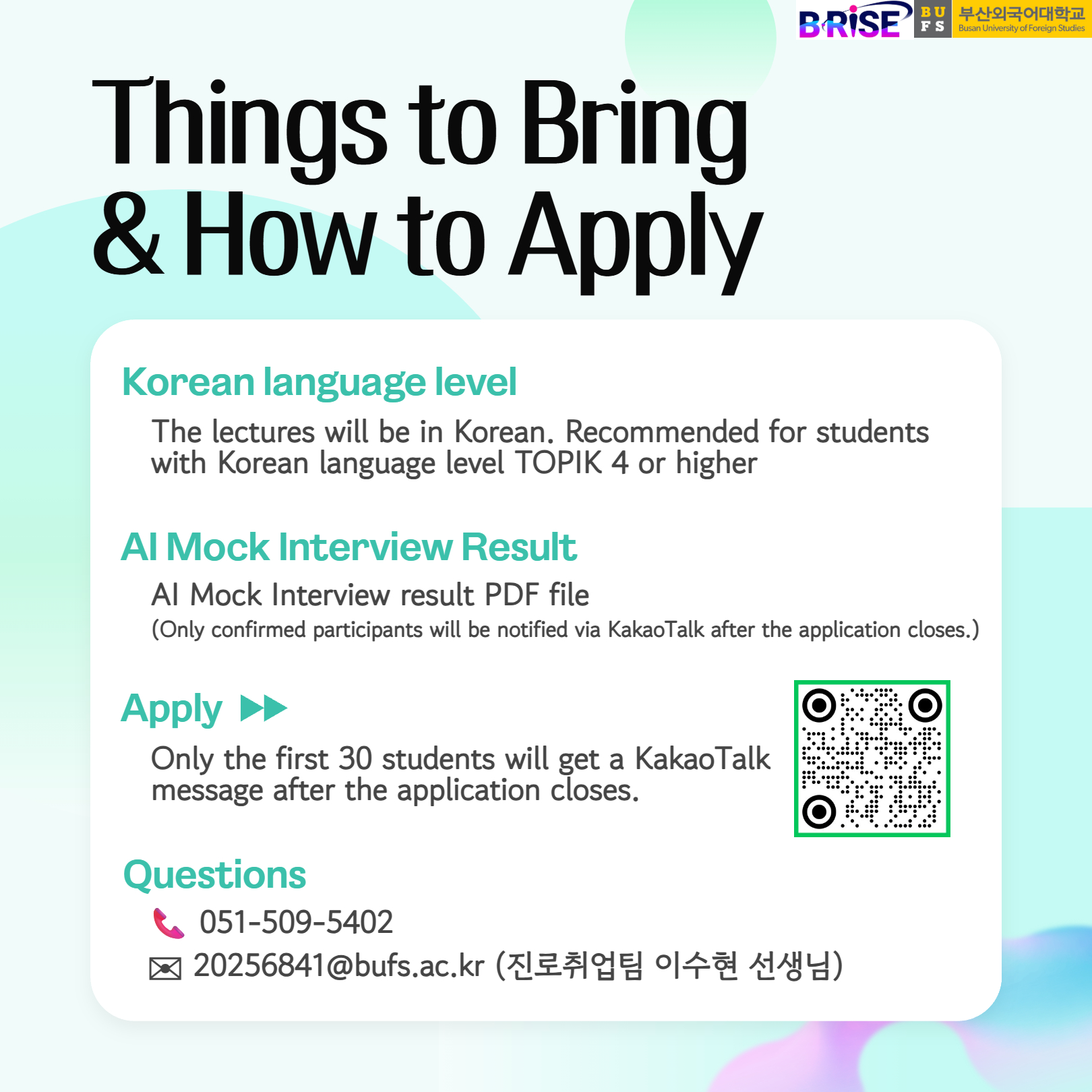공지사항 The 1st BUFS RISE CAREER PREPARATION WORKSHOP 2025 FOR INTERNATIONAL S… 통역번역대학원관리자2025. 10. 1조회수155 제1차 BUFS RISE 국제학생…목록2025학년도 대학원 연구윤리 온…
