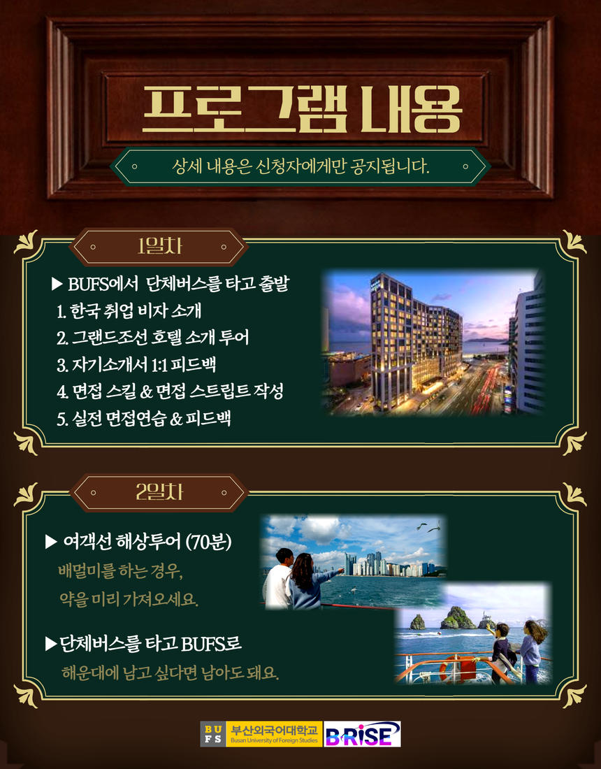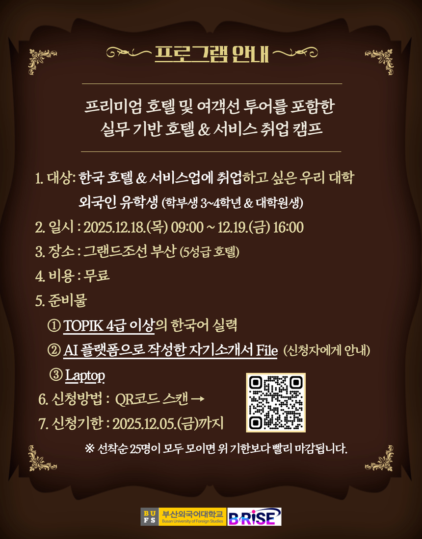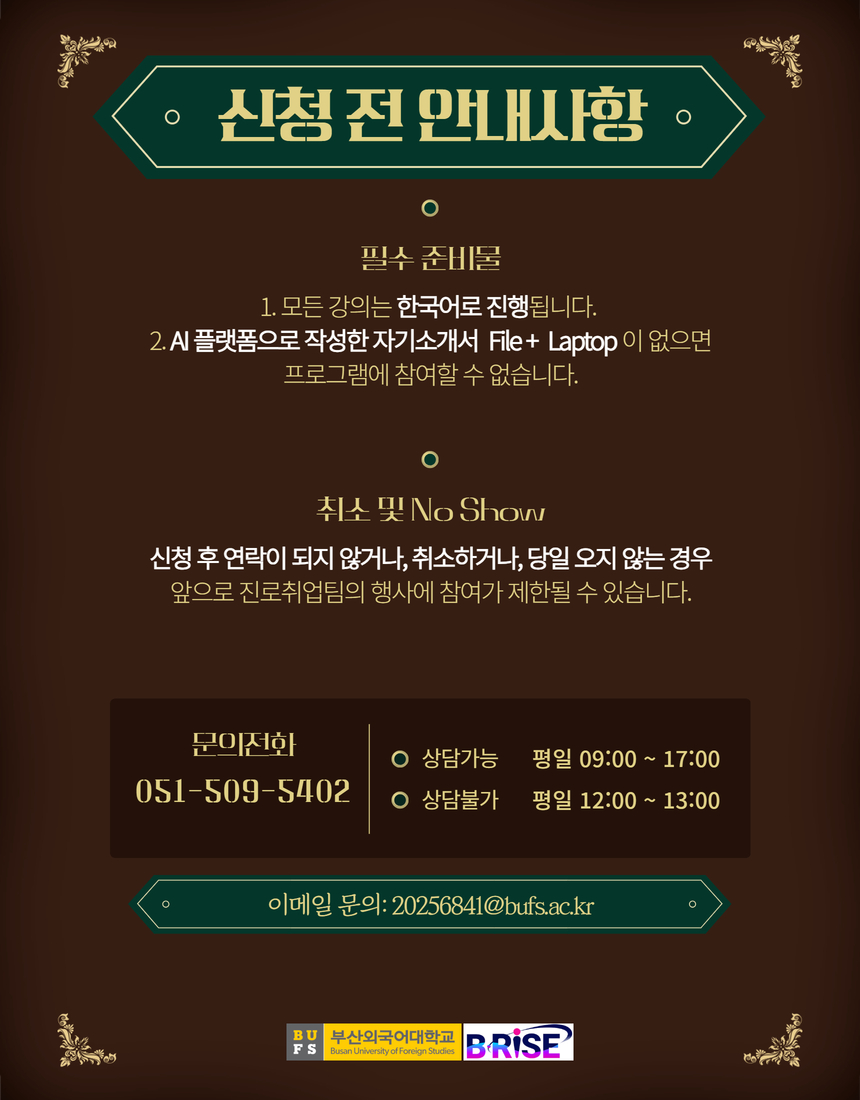 공지사항 [외국인 유학생 ] 2025학년도 제2차 BUFS RISE 국제학생 취업캠프 신청 안내(TOPIK 4급 이상 한국어 실력 … 통역번역대학원관리자2025. 11. 25조회수120 2025학년도 2학기 종합시험 세…목록대학수학능력시험일(11/13) 1…