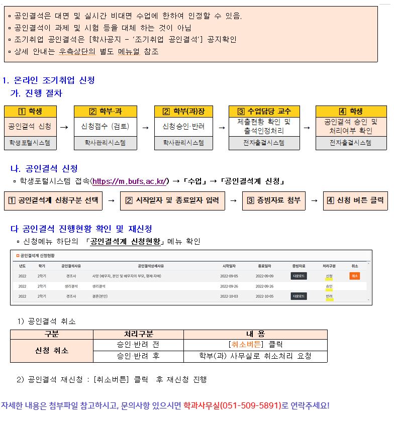 게시판 공지사항 2023학년도 공인결석 신청 방법 및 증빙서류 안내 첨부파일[학생] 공인결석 신청 메뉴얼 22.9.1..pdf(262.6K) 인도어전공2023. 4. 11조회수928 0 등록된 댓글이 없습니다. 전자출결 앱 재설치 안내 (아이폰…목록23학년도 1학기 중간고사 안내