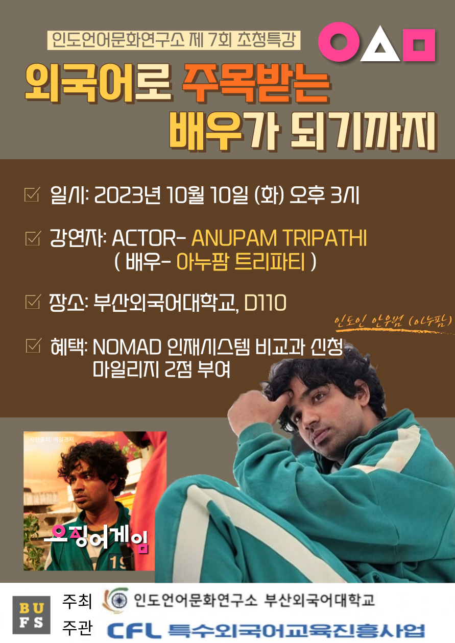 게시판 공지사항 외부 초청 특강(배우-아누팜 트리파티) 인도어전공2023. 10. 6조회수640 0 등록된 댓글이 없습니다. 2023-2 전공 졸업시험(논문)…목록2023학년도 인도 국외연수 후기