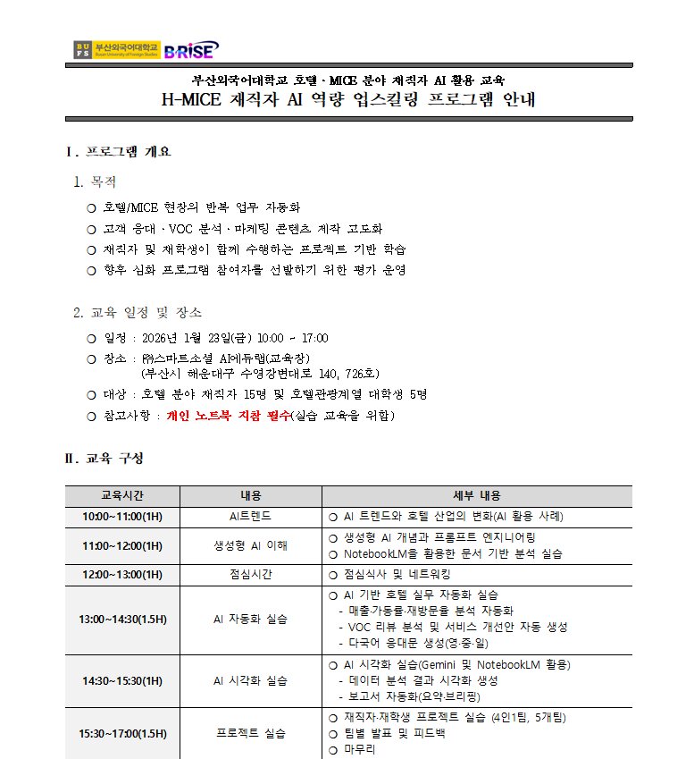 부산외국어대학교 호텔 마이스 분야 AI 활용 교육 프로그램 참가자 모집 중입니다.