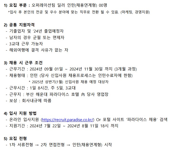 학과게시판 채용공고 ㈜파라다이스부산카지노지점 2024년 하반기 인턴(채용연계형) 모집 상세 내용 위 이미지 확인 바랍니다.관련 문의 : 051-509-6151(학과사무실) 호텔컨벤션전공관리자2024. 8. 5조회수302 0 등록된 댓글이 없습니다. [제주신라호텔] 신입사원 모집목록New-camellia 여객선 승…