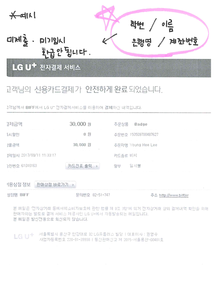 메일제목 : [부산국제영화제 시네필 환급계좌] 학과/학번/이름