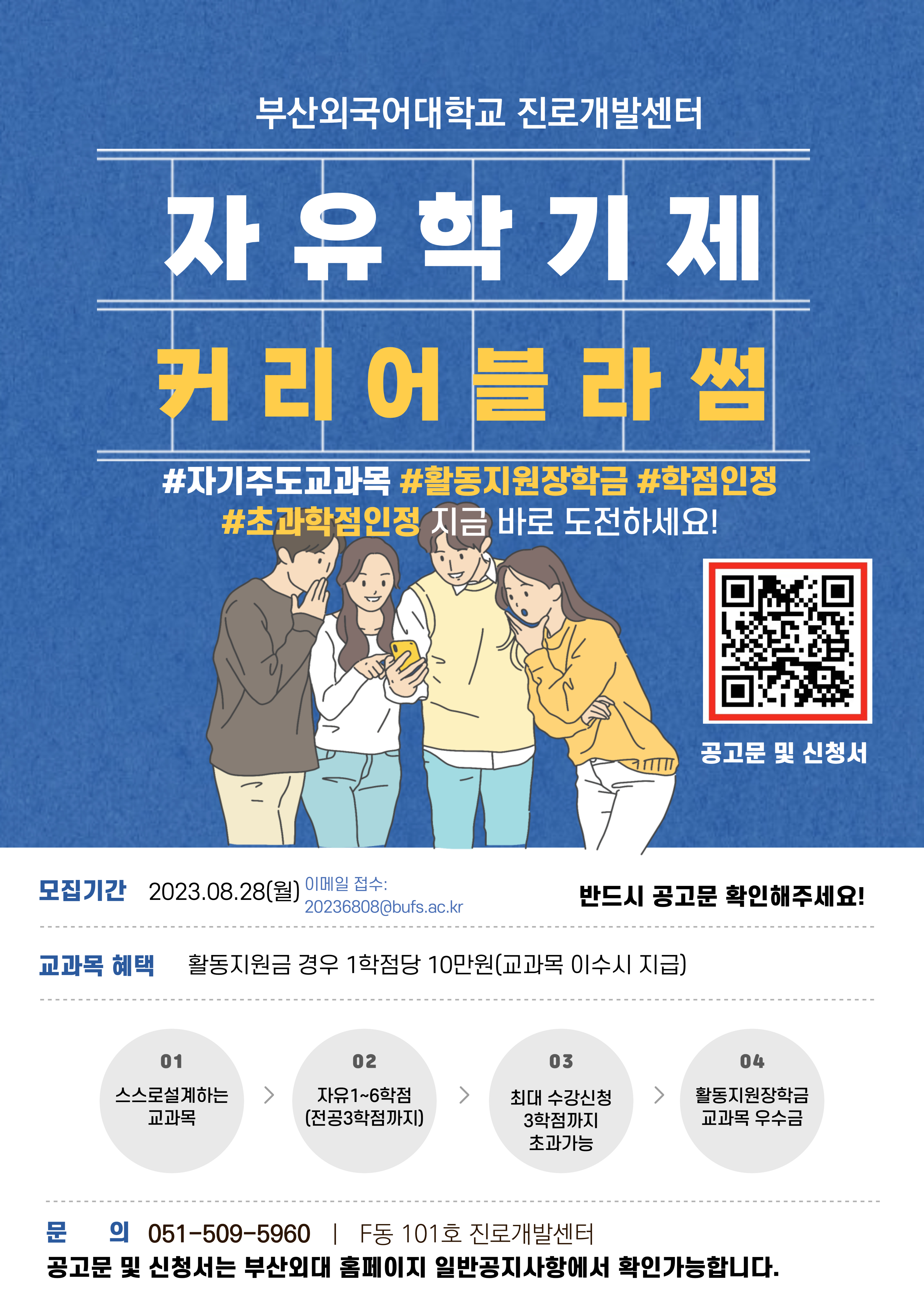 안녕하세요 학우 여러분! 호준 조교 입니다. 이번에 진로개발센터에서 주최하는 프로그램 자유학기제 커리어 블라썸을 모집하오니 많은 관심 부탁드립니다. 지원금, 장학금도 지원하니 꼭! 확인해보시고 신청해보세요 :D