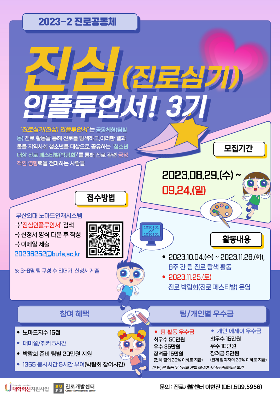 우리 대학 학생들께 다음과 같이 2023학년도 2학기 진로공동체 <진로심기(진심) 인플루언서> 모집을 홍보하고자 안내드립니다.