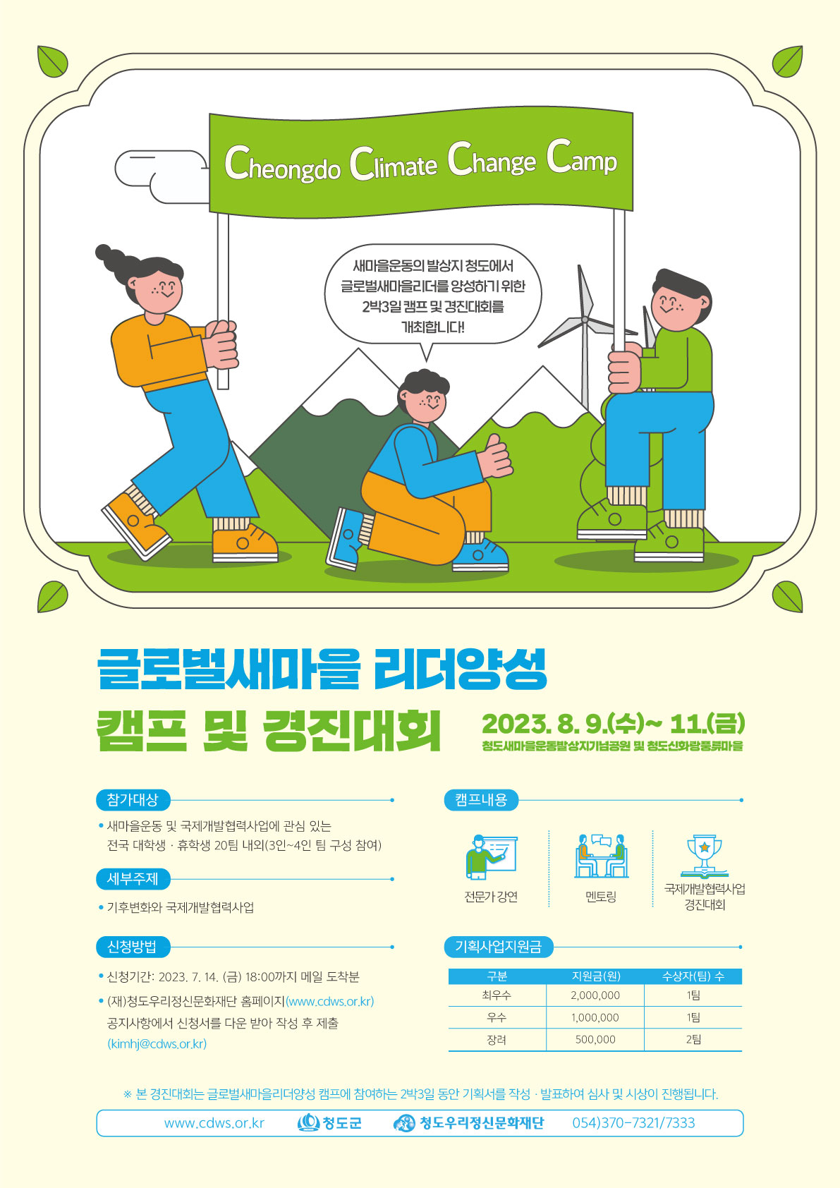 새마을운동발상지 청도에서 세계 시민의식 함양 및 다양한 국제이슈에 효과적으로 대응하기 위해 글로벌새마을리더양성을 위한 캠프 및 경진대회 개최합니다.
