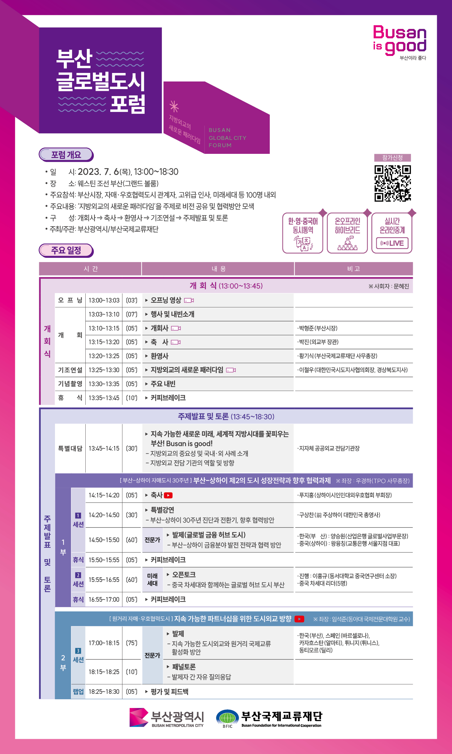 부산시와 부산국제교류재단은 글로벌 허브 도시 부산으로 도약하기 위한 발판으로 오는 7월 6일(목), 웨스틴조선 호텔에서「2023 부산글로벌도시포럼」을 개최합니다